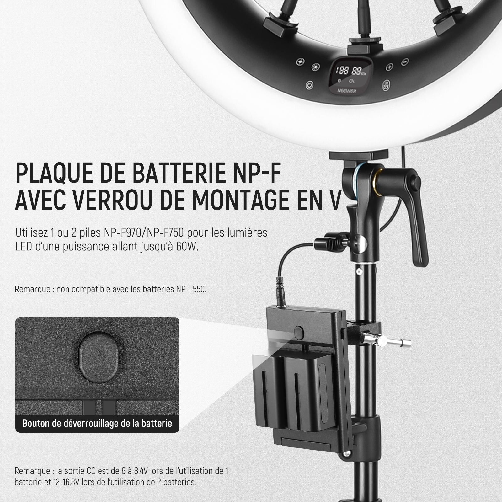 - 【Plaque d'adaptateur de convertisseur de batterie NP-F vers V à double canal 】La plaque de batterie NP-F avec deux canaux peut contenir une batterie NP-F970 ou NP-F750 pour une alimentation autonome ou deux d'entre elles pour charger une lampe,panneau lumineux LED ou anneau lumineux avec une puissance d'éclairage continue allant jusqu'à 60W.Il dispose d'un verrou de batterie pour une installation/retrait facile et d'un verrou latéral pour le détachement de l'adaptateur de montage en V.