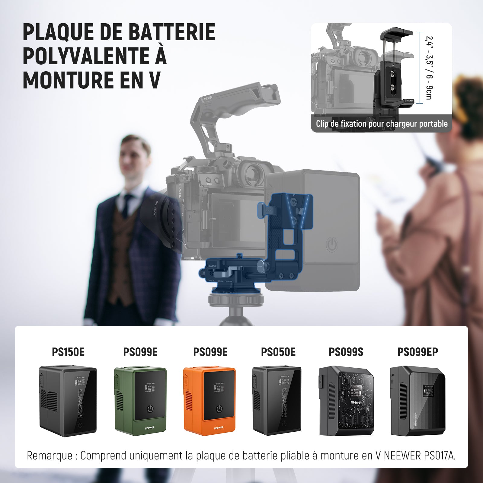 • 【Batterie Plaque polyvalente à monture V】Cette plaque compacte & légère à monture V vous permet de monter simultanément un appareil et une batterie à monture V.Dotée d'un adaptateur de plaque de monture V amovible,d'un support amovible pour chargeur et d'une 1/4" vis pour fixation d'accessoires filetés 1/4" tels qu'une plaque d'adaptation de batterie NP-F,elle offre multiples solutions d'alimentation.Remarque:Uniquement pour Batteries à monture V NEEWER (PS099E,PS099EP,PS150E,PS050E,PS099S).