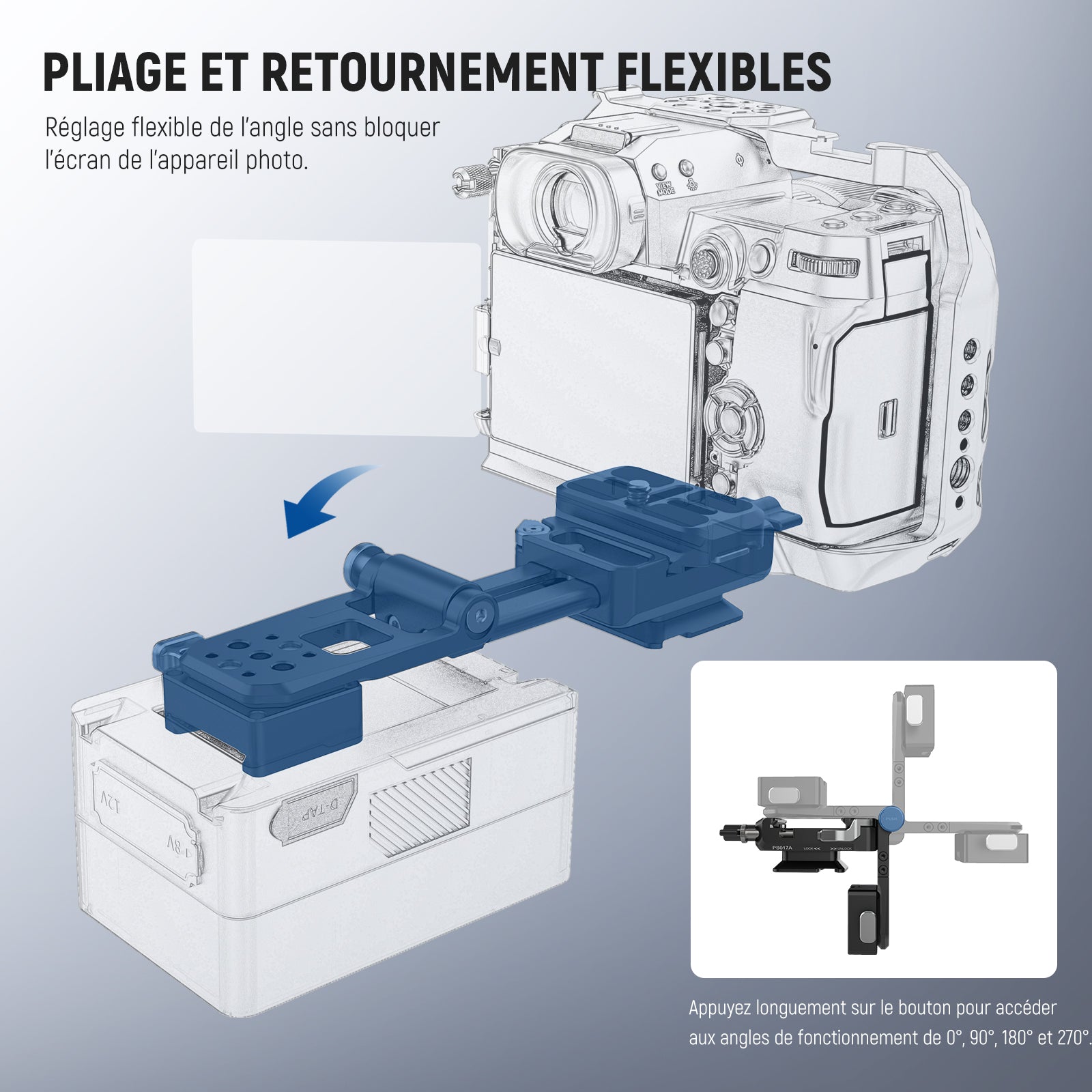 • 【Positionnement flexible de la batterie et Conception portable】Cette plaque de batterie pliable à monture en V offre 3 angles réglables (90°/180°/270°), permettant un montage vertical ou horizontal sans gêner l'écran rabattable de la caméra. Pliable à plat, elle facilite le rangement et le transport, idéale pour les indispensables des créateurs de contenu et des influenceurs.