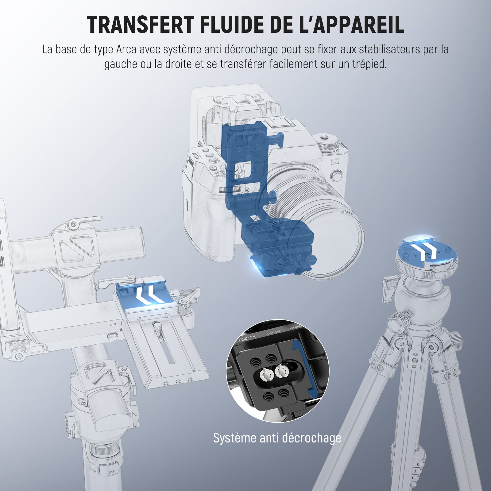 • 【Transfert d'appareil fluide】 Compatible avec DJI RS4 RS 4 Pro RS3 RS 3 Pro RS 2 RS2 et RSC 2 RSC2 Cardans stabilisateurs portables,la base de type Arca avec anti-décrochage peut se fixer aux cardans par la gauche ou la droite et se transférer de manière transparente sur un trépied pour un enregistrement vidéo stable