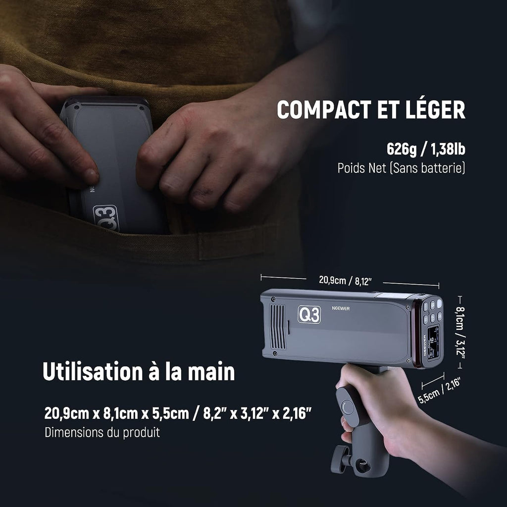 - Flash Stroboscopique Portable- NEEWER flash Q3 est un flash léger et puissant, offrant une puissance de 200w pour seulement 626g. Ce flash portable peut être placé et transporté dans votre poche. Il est idéal pour les photographes qui voyagent. Remarque : Le micrologiciel Q3 peut être mis à niveau en cas de problème d'incompatibilité.