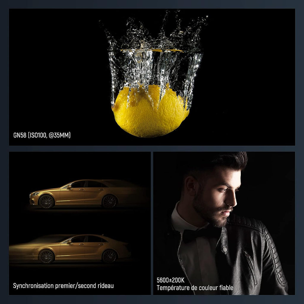 - Performance Maximale- Flash puissant avec un nombre guide élevé (GN58 : ISO100, @35mm), une puissance de 200W réglable sur 8 niveaux de 1/128 à 1/1 et une durée du flash réduite à 1/15380s. La batterie de 14,4V 3200mAh permet 500 flashs à pleine puissance avec un recyclage rapide de 0,01 à 1,8s.