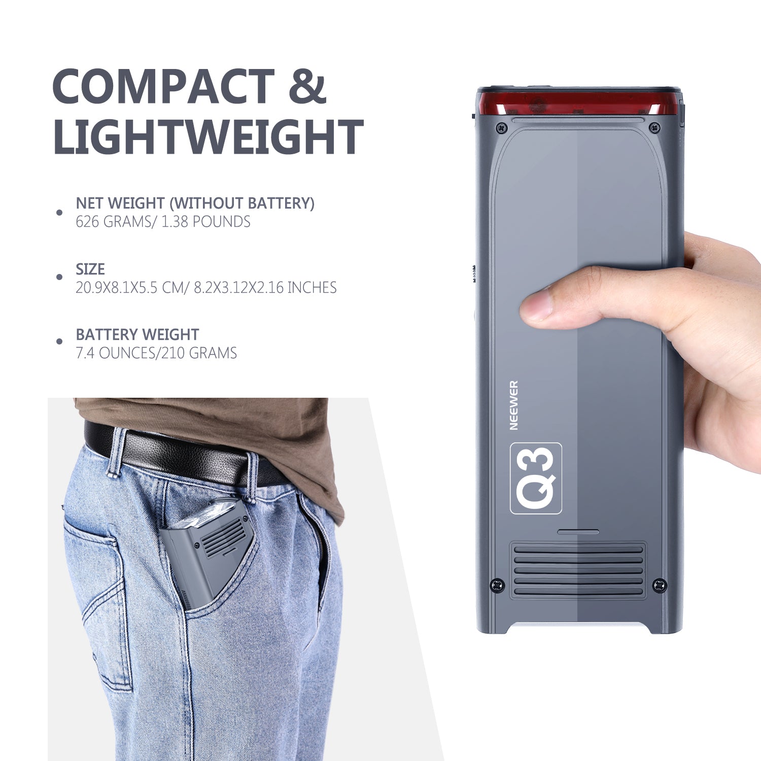 ÉCLAIRAGE FLASH PORTABLE SPEEDLITE : Le NEEWER Q3 offre la possibilité d'être portable, ce qui signifie que vous pouvez vraiment emporter le flash speedlite dans votre poche. La puissance du flash atteint 200W. Il est très pratique pour ceux qui ont besoin de transporter le flash partout où ils veulent et de prendre des photos. C'est pourquoi le Q3 est appelé "Pocket Flash".