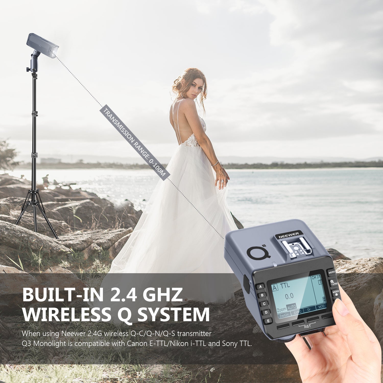 - DÉCLENCHEUR FLASH SANS FIL 2,4G : Lorsque vous utilisez le déclencheur sans fil Q-N 2,4G, le monolight Speedlite Q3 est compatible avec les appareils photo Nikon TTL. Le déclencheur flash sans fil Q-N TTL dispose de 5 groupes au total et de 32 canaux, prend en charge le flash TTL automatique, la synchronisation haute vitesse 1/8000s, le flash multiple, le flash manuel, la compensation d'exposition au flash, le contrôle de la lampe pilote de groupe, le zoom de groupe, l'ajustement simultané de la valeur de sortie de tous les groupes (Remarque : batterie non incluse).