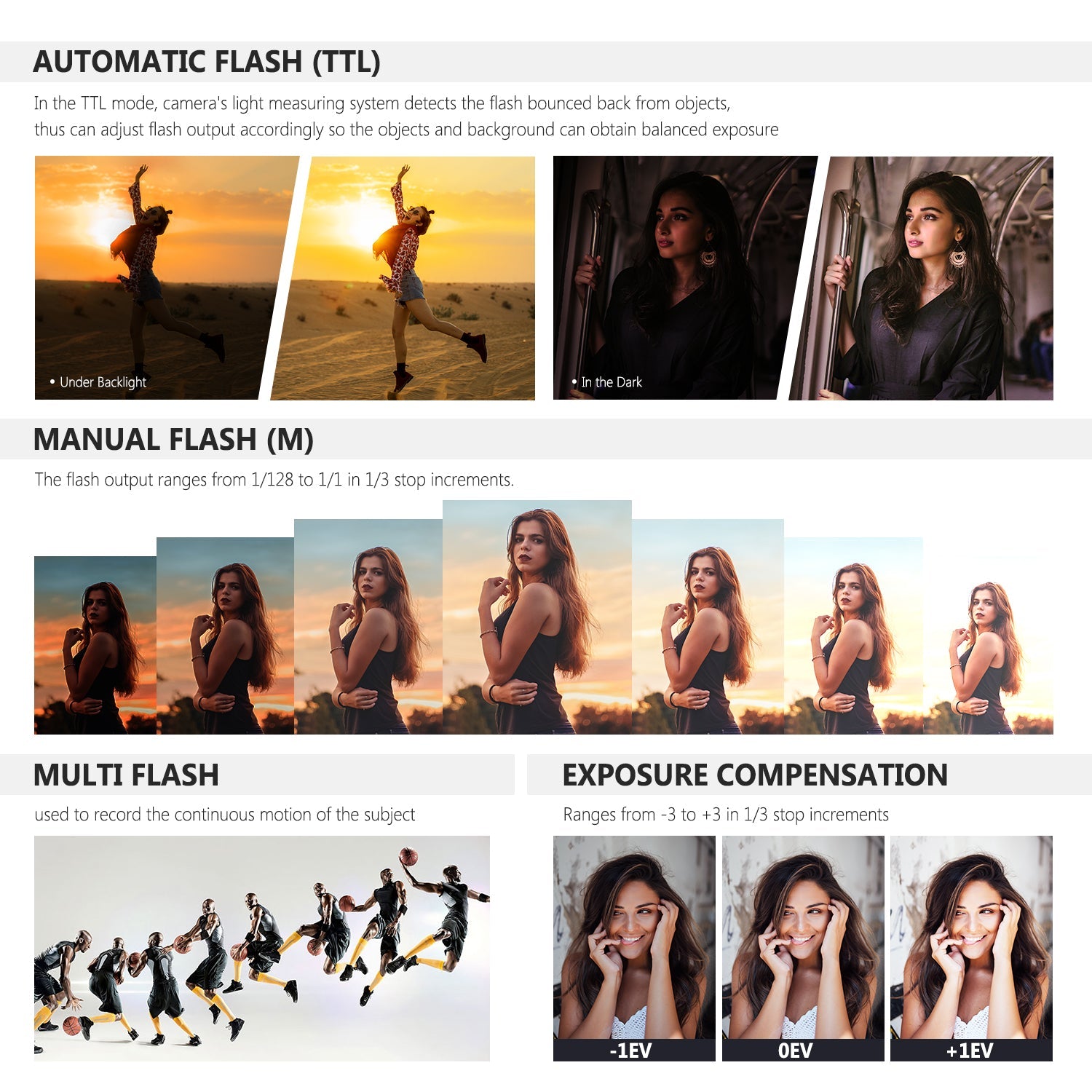 - Modes de flash : arrêt sans fil, TTL/M/MUTIL (prise en charge de la compensation d'exposition au flash)