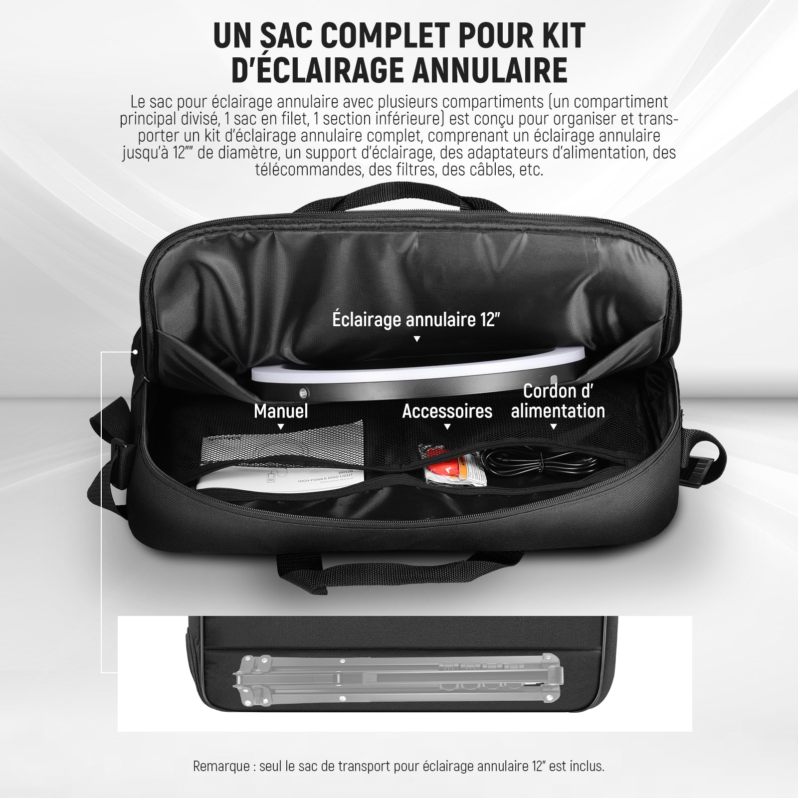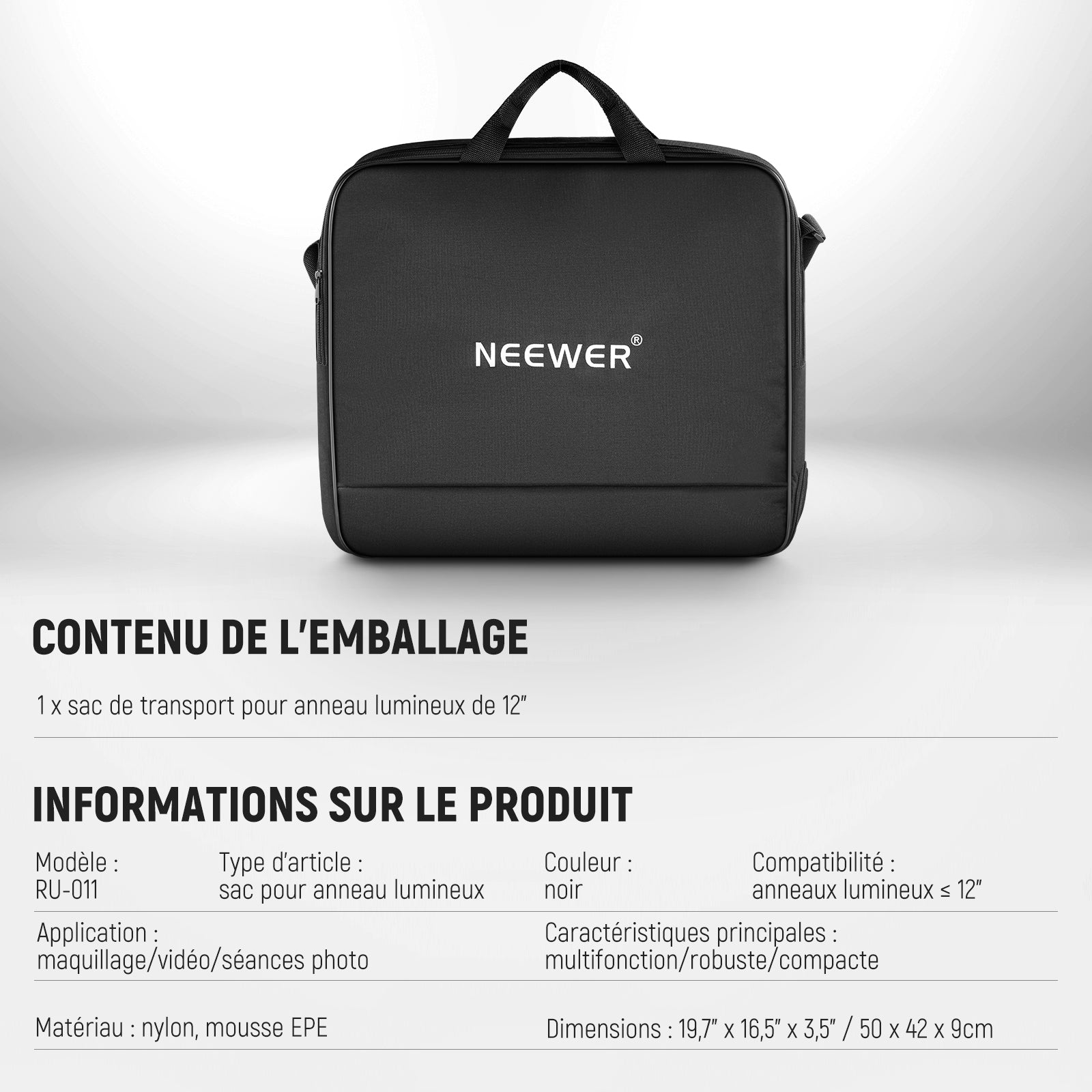 - 【Un sac complet pour kit d'éclairage annulaire】 Le sac d'éclairage annulaire NEEWER RU-011 avec plusieurs compartiments (un compartiment principal divisé, 1 sac en filet, 1 section inférieure) est conçu pour organiser et transporter un kit d'éclairage annulaire complet,y compris un éclairage annulaire jusqu'à 12" de diamètre, un support d'éclairage, des adaptateurs d'alimentation,des télécommandes, des filtres, des câbles,etc. Gardez vos essentiels à portée de main partout où vous en avez besoin