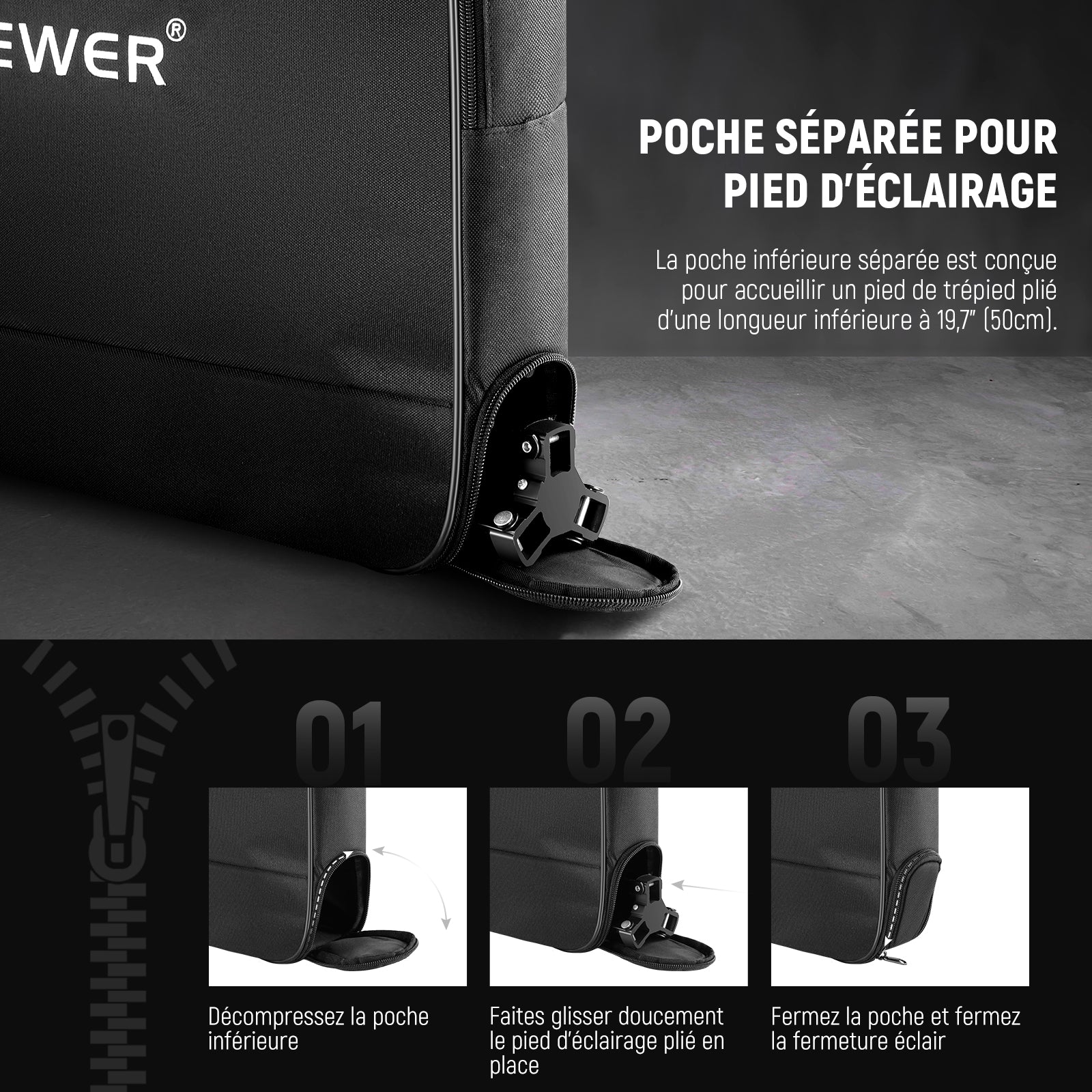 - 【Section séparée pour support d'éclairage plié】 Il y a une section de rangement de barre individuelle en bas, qui peut accueillir un support d'éclairage plié/trépied jusqu'à 19,7"/50cm de long, gardant votre éclairage annulaire avec une surface délicate séparée du support métallique pour une protection optimale contre les rayures sur la lumière