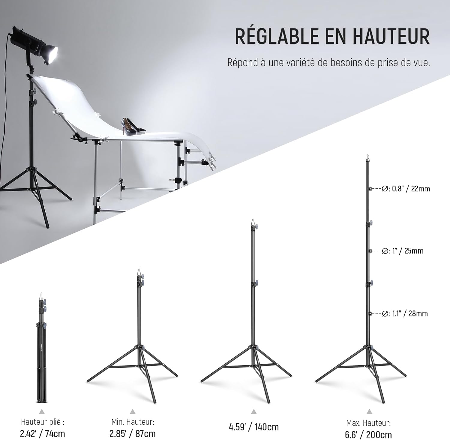 - 【Support d'éclairage en aluminium ultra robuste】Ce support d'éclairage de photographie professionnel est entièrement métallique avec un alliage d'aluminium anodisé, durable et résistant à la corrosion. Avec des diamètres de tube épaissis dans les 3 sections (28/25/22mm), il a une capacité de charge maximale de 22,05lb/10kg et peut facilement supporter une large gamme d'équipements photographiques. Idéal pour la photographie en studio et en extérieur