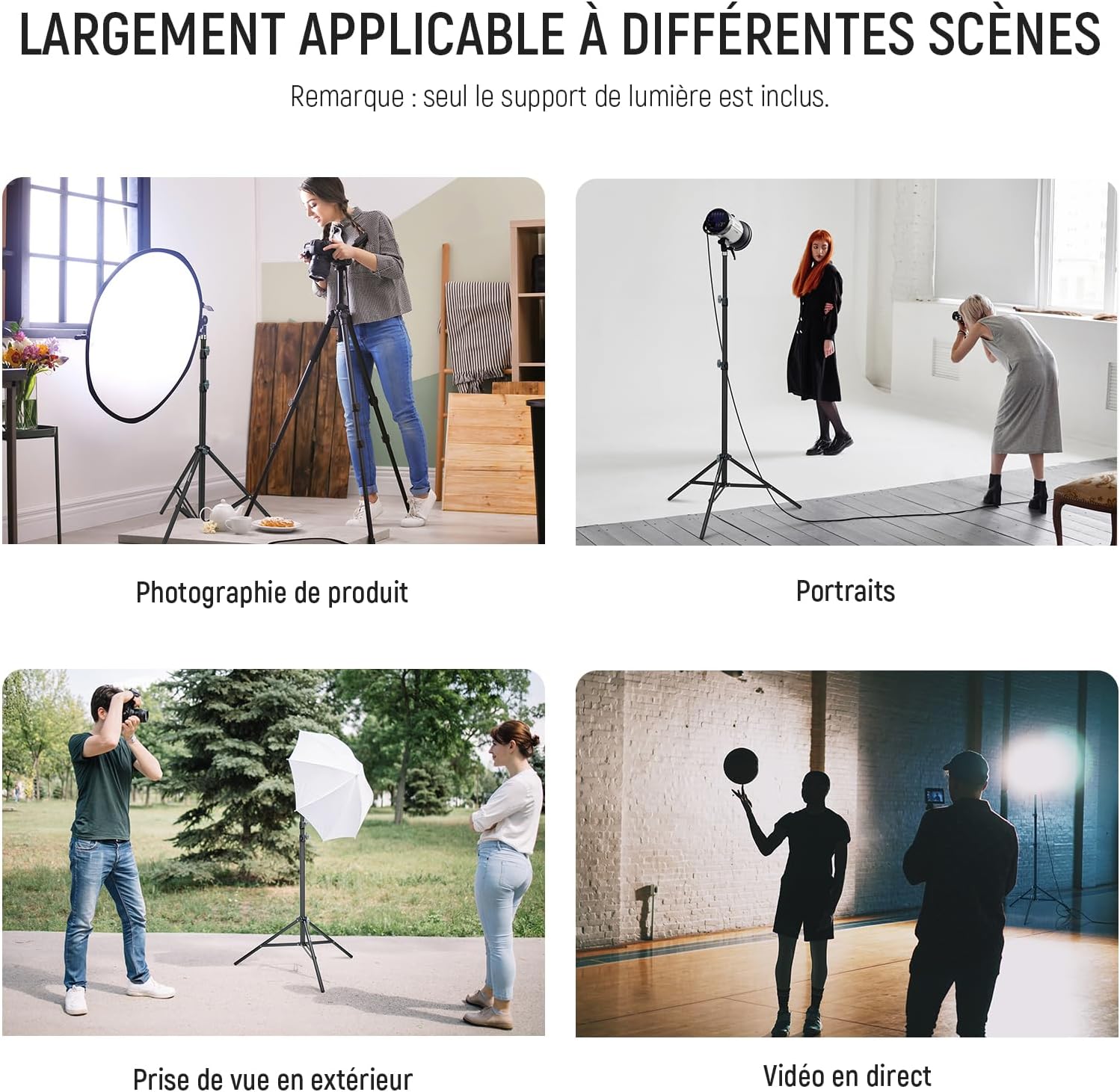 - 【Pliable et portable】 Les pieds peuvent être facilement dépliés et solidement verrouillés en position avec le bouton de verrouillage. Le support en aluminium pliable est léger pour un transport facile. Remarque : Seul le support de lumière est inclus