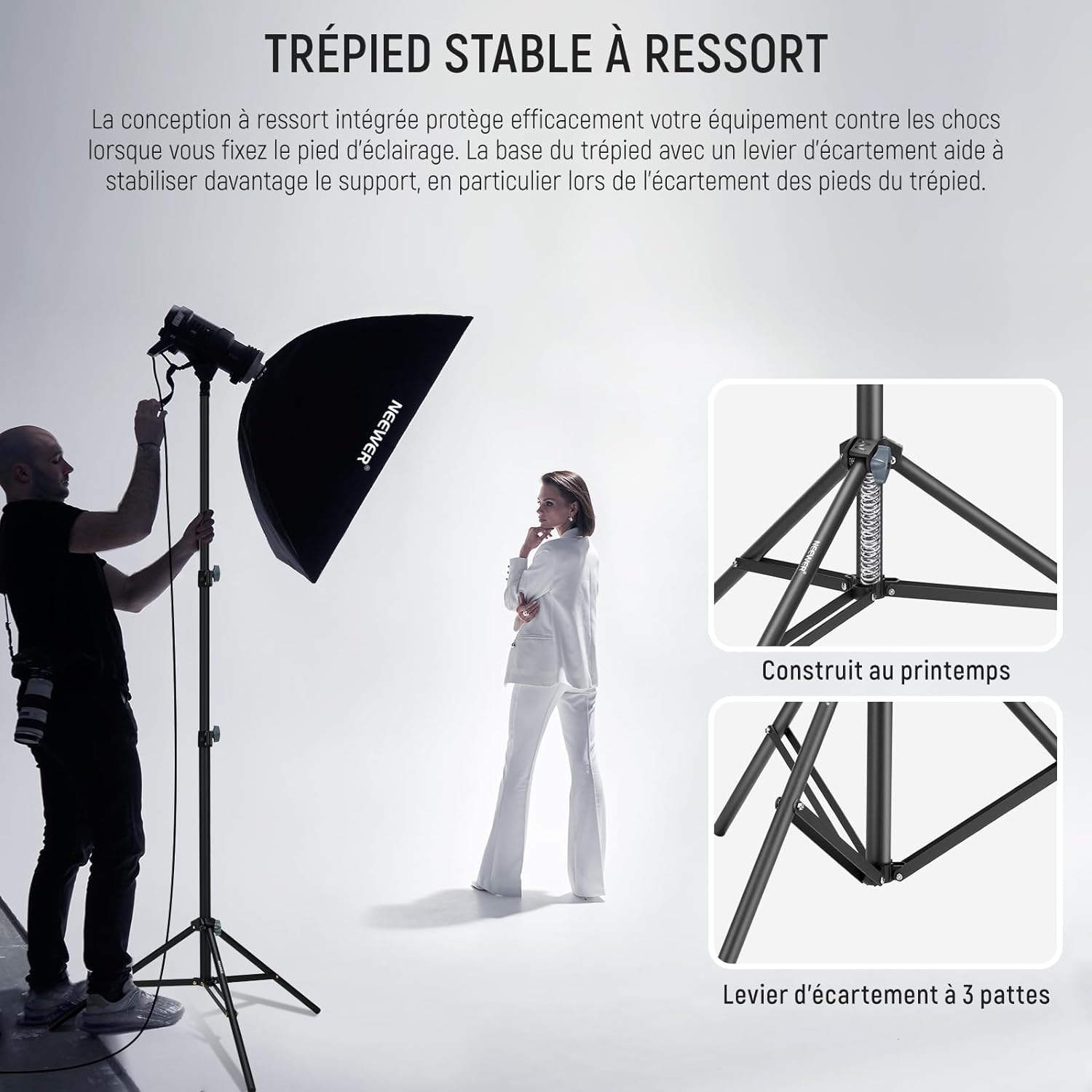 - 【Trépied stable à ressort】 La conception à ressort avec ressort tampon intégré protège efficacement votre équipement des dommages causés par les chocs lorsque vous desserrez le support de lumière. La base du trépied avec levier d'écartement aide à stabiliser davantage le support, en particulier lors de l'écartement des pieds du trépied