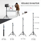 - 【Support d'éclairage en métal robuste】Construit en aluminium de qualité supérieure avec une finition mate, le support d'éclairage de photographie peut supporter des charges jusqu'à 4,4 lb/2kg et est résistant à la corrosion et aux impacts, garantissant durabilité et stabilité pour une utilisation prolongée. La base du trépied est conçue avec un coussinet en caoutchouc sur chaque pied pour éviter de glisser et éliminer les rayures au sol