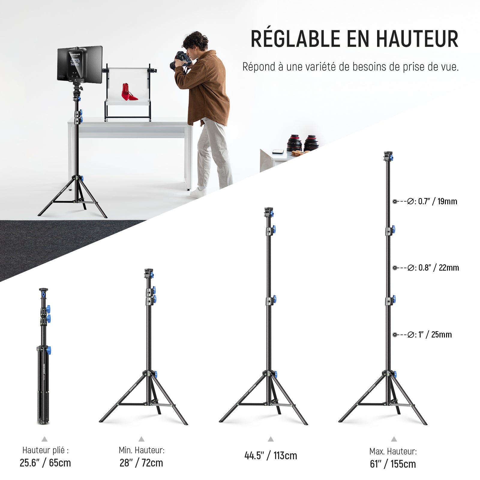 - 【Support de trépied extensible de 28"-61"/72-155cm】 Ce trépied de prise de vue est une structure télescopique en 3 sections, offrant des extensions de hauteur de 28"-61"/72-155cm pour des options de positionnement polyvalentes, adaptées aux selfies, aux vlogs, à la photographie en studio, au streaming en direct, à l'enregistrement vidéo YouTube/Tiktok, et plus encore. Entre chaque deux sections, nous avons conçu un bouton pour un réglage et un verrouillage rapides