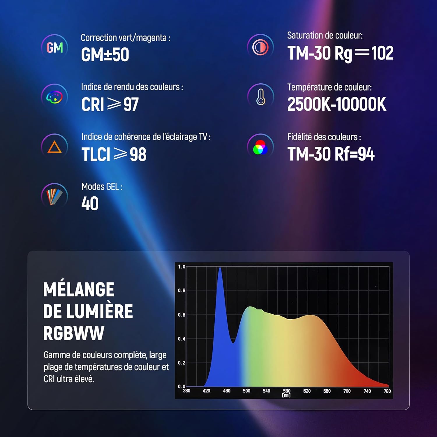 • Technologie exclusive de mélange de lumière RGBWW- Les LED de qualité supérieure et un diffuseur incurvé à haute transmission lumineuse offrent un éclairage doux et un éclairement de 1730lux/0,5m.La technologie RGBWW apporte un spectre de couleurs complet en mélangeant la lumière rouge,verte,bleue et blanche dans des rapports précis.La température de couleur est de 2500K-10000K réglable avec une correction de couleur de -50/+50 GM.CRI97+/TLCI 98+ garantit une reproduction précise des couleurs.