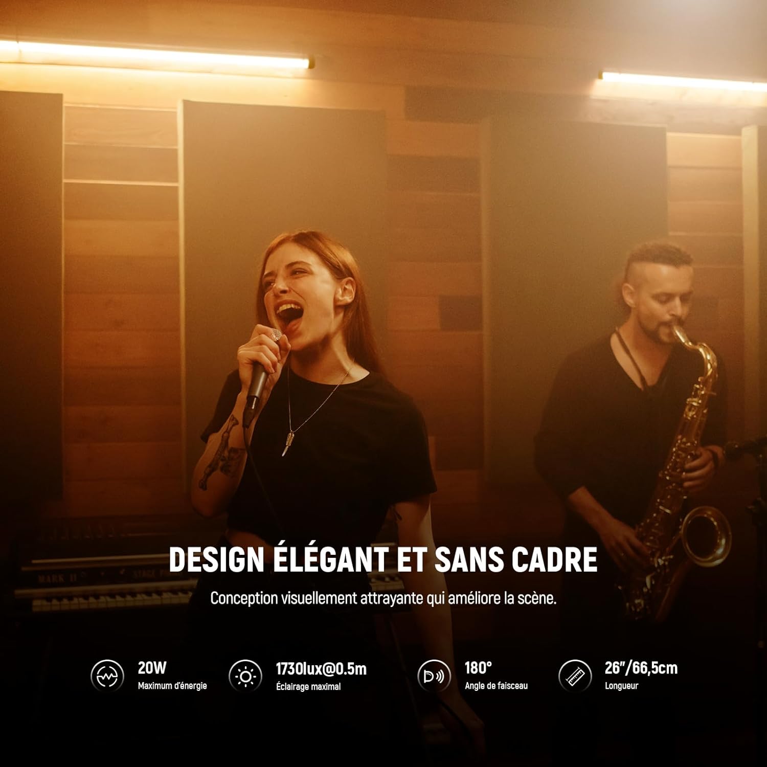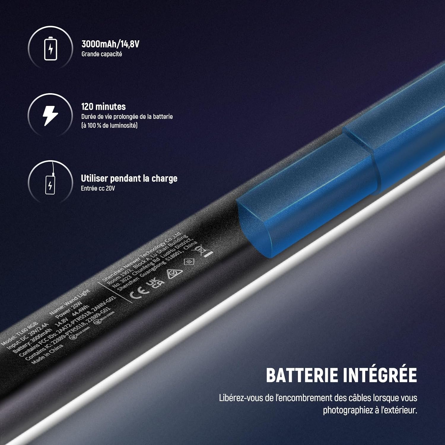 • Batterie rechargeable pour la portabilité- TL60 RGB pèse 29oz (820g) et mesure 1,7 "x 26" (42 x 665mm), ce qui est portable et parfait comme lampe vidéo LED portable. La source de lumière linéaire présente un angle de faisceau de 180 ° et une apparence exquise qui peut fonctionner comme une lumière de style. La puissante batterie intégrée de 3000 mAh offre une autonomie de 120 minutes à pleine puissance, et un adaptateur secteur inclus prend en charge la charge tout en utilisant