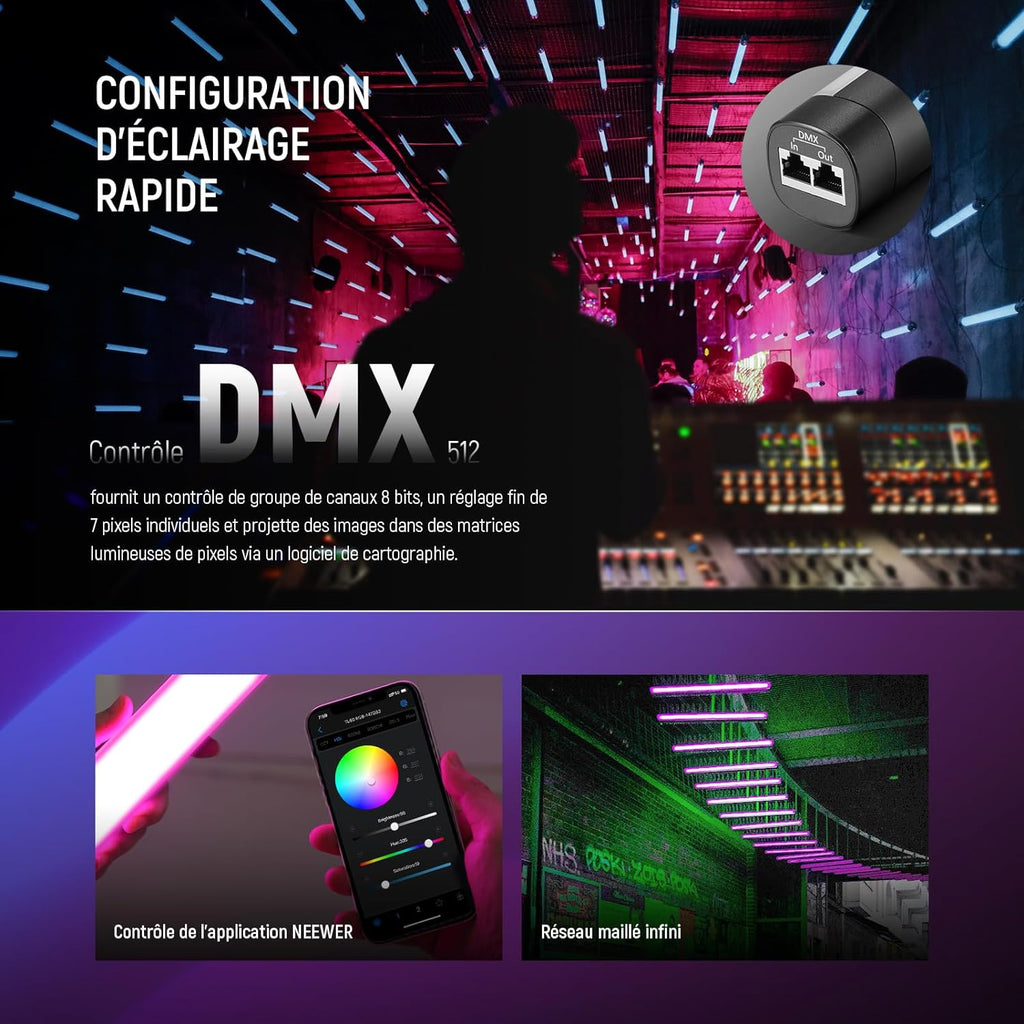 • Plusieurs méthodes de contrôle et de montage-  Outre les boutons de contrôle physiques, vous pouvez contrôler sans fil la barre lumineuse avec l'application NEEWER ou entrer en mode 2,4G pour le contrôle à distance et de groupe. Pour les utilisateurs professionnels, vous pouvez également contrôler la lumière via DMX512 8 bits. La lumière peut être montée sur un pied d'éclairage via son filetage 1/4" ou accrochée à une barre transversale avec le fil d'acier inclus.