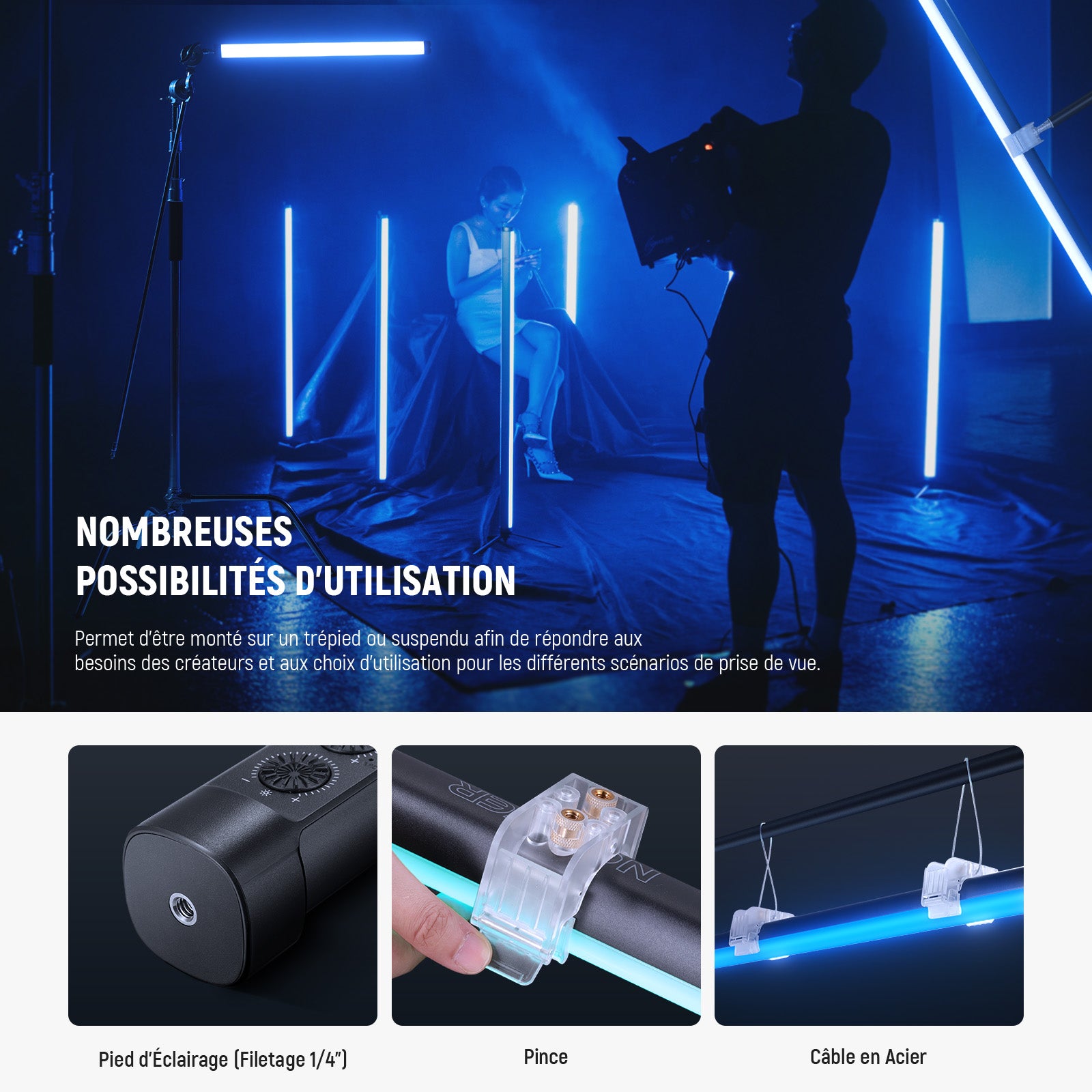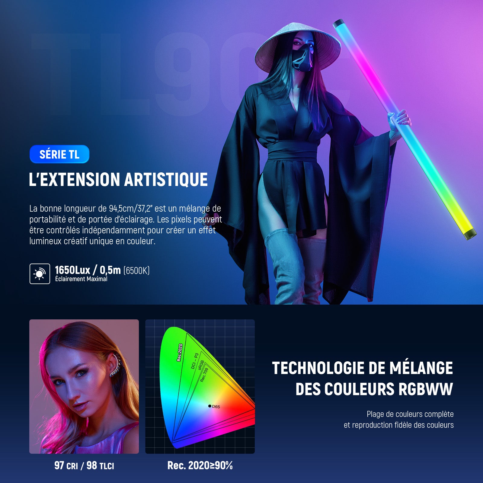 - 【Tube Lumineux LED 37" avec RGBWW】 Le TL90C, avec une longueur de 94,5cm/37,2", un éclairement de 1650Lux/0,5m, offre bon éclairage sans compromettre la portabilité. Ce stick lumineux de 30W fournit un éclairage doux et uniforme avec une grande fidélité des couleurs (CRI 97/TLCI 98) et une vaste plage de température de couleur de 2500-10000K. Doté de la technologie de mélange RGBWW, il restitue l'intégralité des couleurs RGB, couvrant plus de 90% de l'espace colorimétrique Rec. 2020