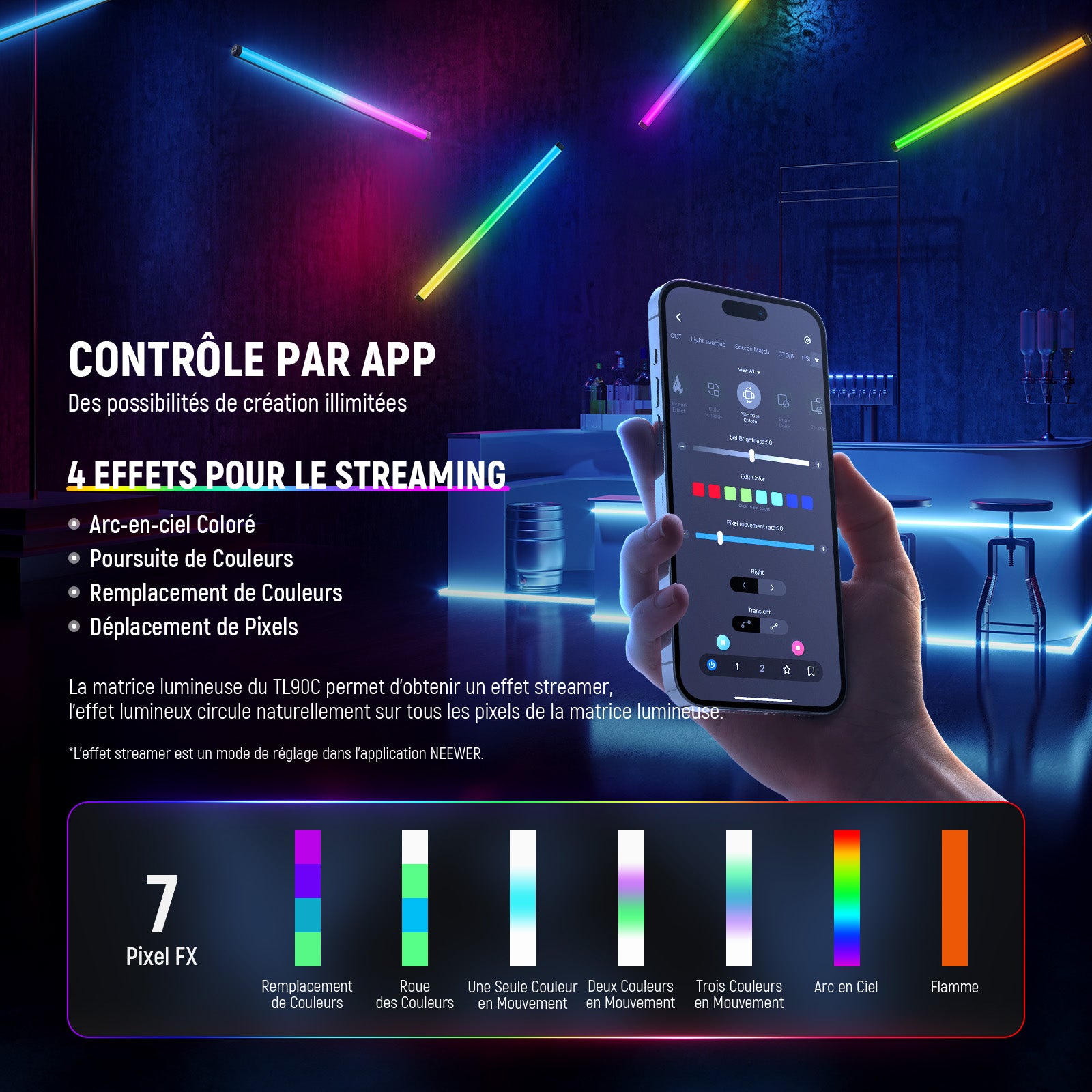 - 【Contrôle Embarqué/APP/2,4G/DMX】 Le TL90C peut être contrôlé par des boutons physiques ou sans fil grace au système 2,4G et à l'APP NEEWER. Grace à la technologie propriétaire Infinity Network Meshing, jusqu'à 256 éclairages peuvent être contrôlés simultanément, plusieurs éclairages TL90C peuvent être programmés pour créer des effets dynamiques : Arc-en-Ciel, Poursuite de Couleurs, Mouvement de Pixels... Vous pouvez aussi utiliser des consoles DMX512 pour un contrôle précis des pixels du TL90C