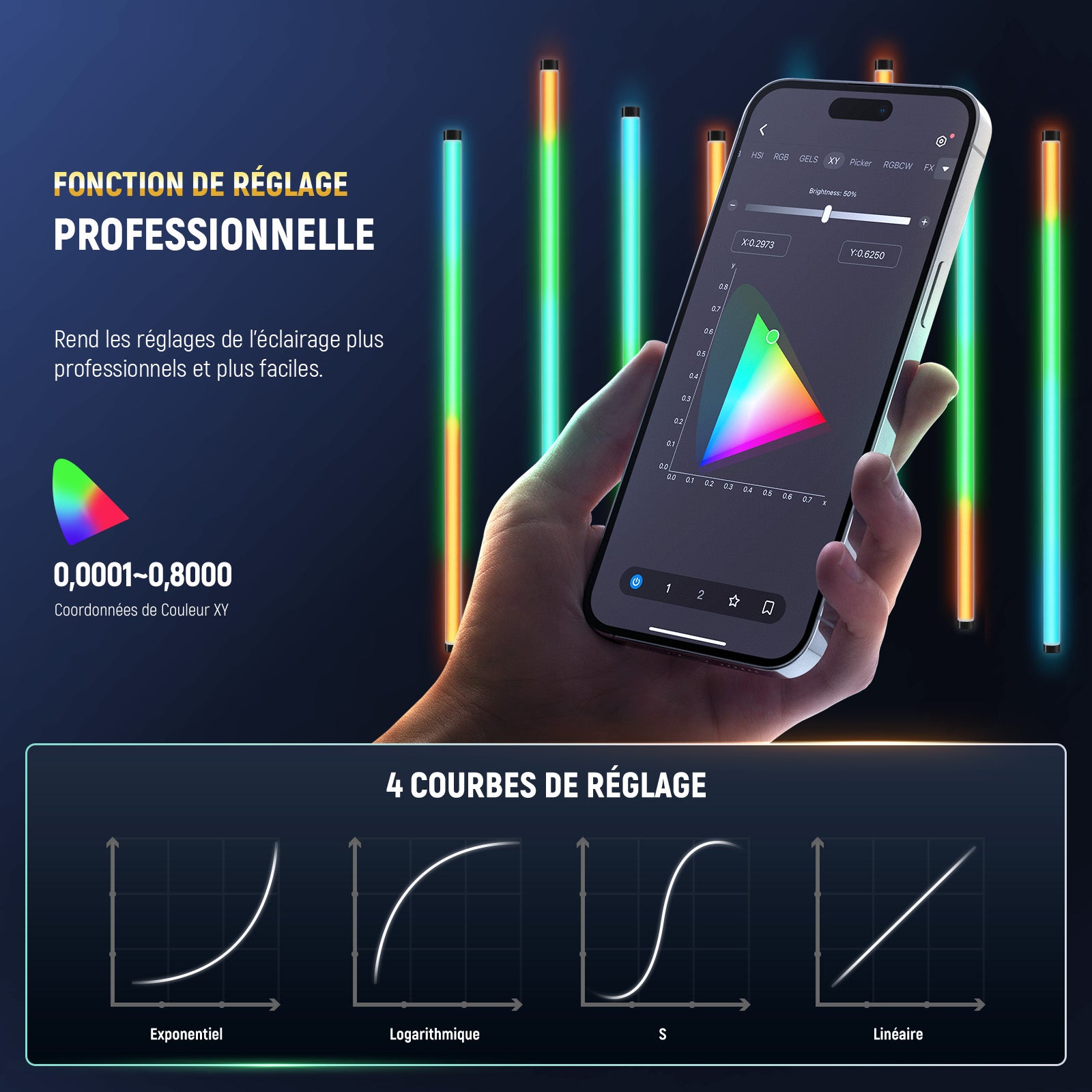 - 【Réglage PWM Précis】 Le tube LED portable offre 4 courbes de réglage (Linéaire/S/Logarithmique/Exponentielle) et des profils de réglage X/Y, pour un réglage de la luminosité professionnel et progressif. Les modes incluent HSI pour 36000 couleurs, RGBCW pour un réglage des couleurs de 0 à 255 et le mode ROSCO & LEE pour restituer entièrement 40 gels de couleur. Faites glisser votre doigt sur la zone tactile pour sélectionner les couleurs, elle peut être désactivée d'une simple pression