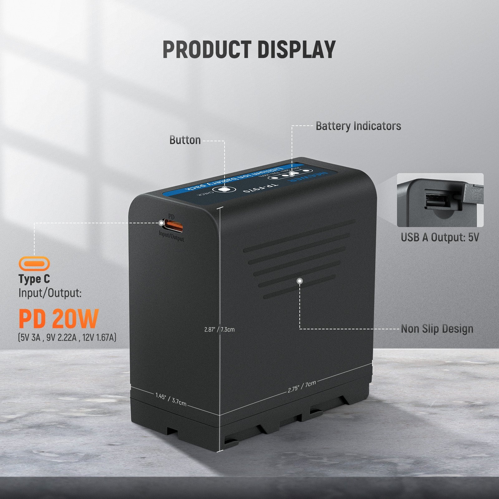 - Deux Ports & Recharge Facile- La batterie NP-F970 est équipée d'un port USB A et d'un port USB C bidirectionnel. Le port USB C peut être utilisé comme entrée ou sortie et supporte la charge rapide 20W PD pour recharger complètement la batterie en 3,5 heures. Le port USB A offre une sortie de 5V pour charger les smartphones et les tablettes. Rechargez la batterie à l'aide d'adaptateurs secteur, de chargeurs de voiture et de chargeurs portables.