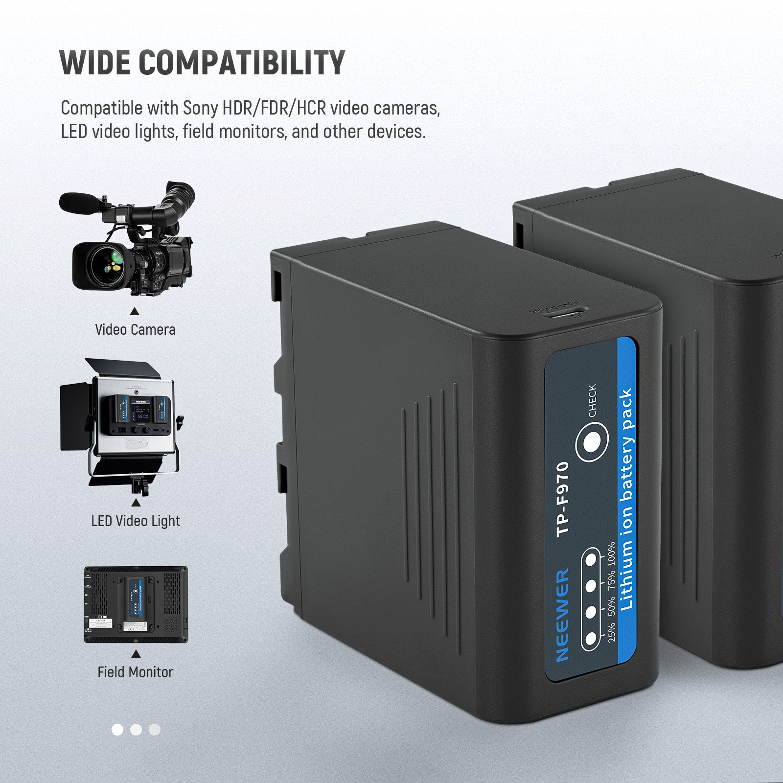- Compatibilité Étendue- Remplace toutes les batteries de la série NP-F, comme : NP-F550 NP-F570 NP-F750 NP-F770 NP-F960 NP-F970 NP-F975. Compatible avec Sony caméras et caméscopes des séries comme CCD-RV CCD-SC CCD-TR CCD-TRT CCD-TRV CVX DSR DCR GV HDR HVL HVR MPK MVC PBD PLM, NEEWER panneaux LED, ring lights et moniteurs de champ.