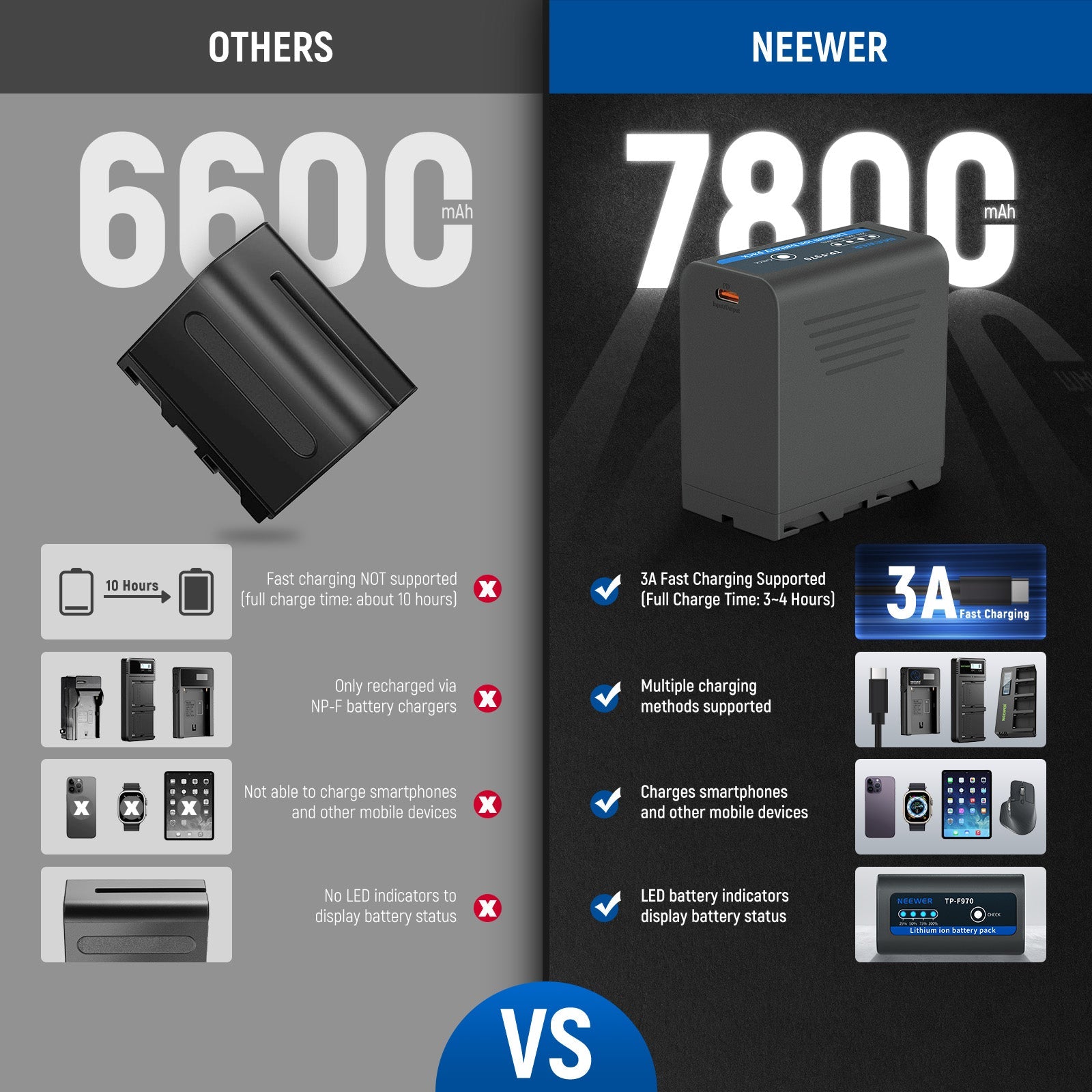 - Nouvelle Batterie de Rechange de Plus Grande Capacité- La batterie lithium rechargeable TP-970 de NEEWER possède une grande capacité (7,2V 7800mAh 56,16Wh) et une plus grande durée de vie que les batteries NP-F ordinaires. Fabriquée avec des cellules de qualité supérieure, elle peut vous fournir une alimentation abondante et constante pour capturer tous les merveilleux moments de la vie.