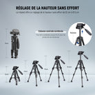 - Réglage de la hauteur sans effort et colonne centrale surélevée : le trépied offre un réglage de la hauteur sans effort grâce à son design polyvalent. Les pieds à 3 sections peuvent être facilement ajustés de 25 cm à 48 cm à l'aide de verrous à rabat, tandis que la colonne centrale peut être surélevée jusqu'à 8 cm. Avec une plage de hauteur totale de 32 à 61,5 cm, ce trépied offre une flexibilité pour capturer la photo parfaite dans toutes les situations