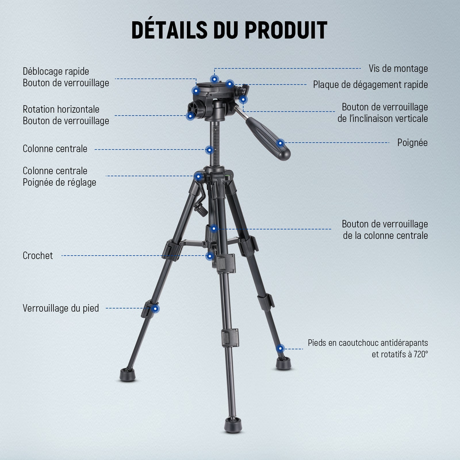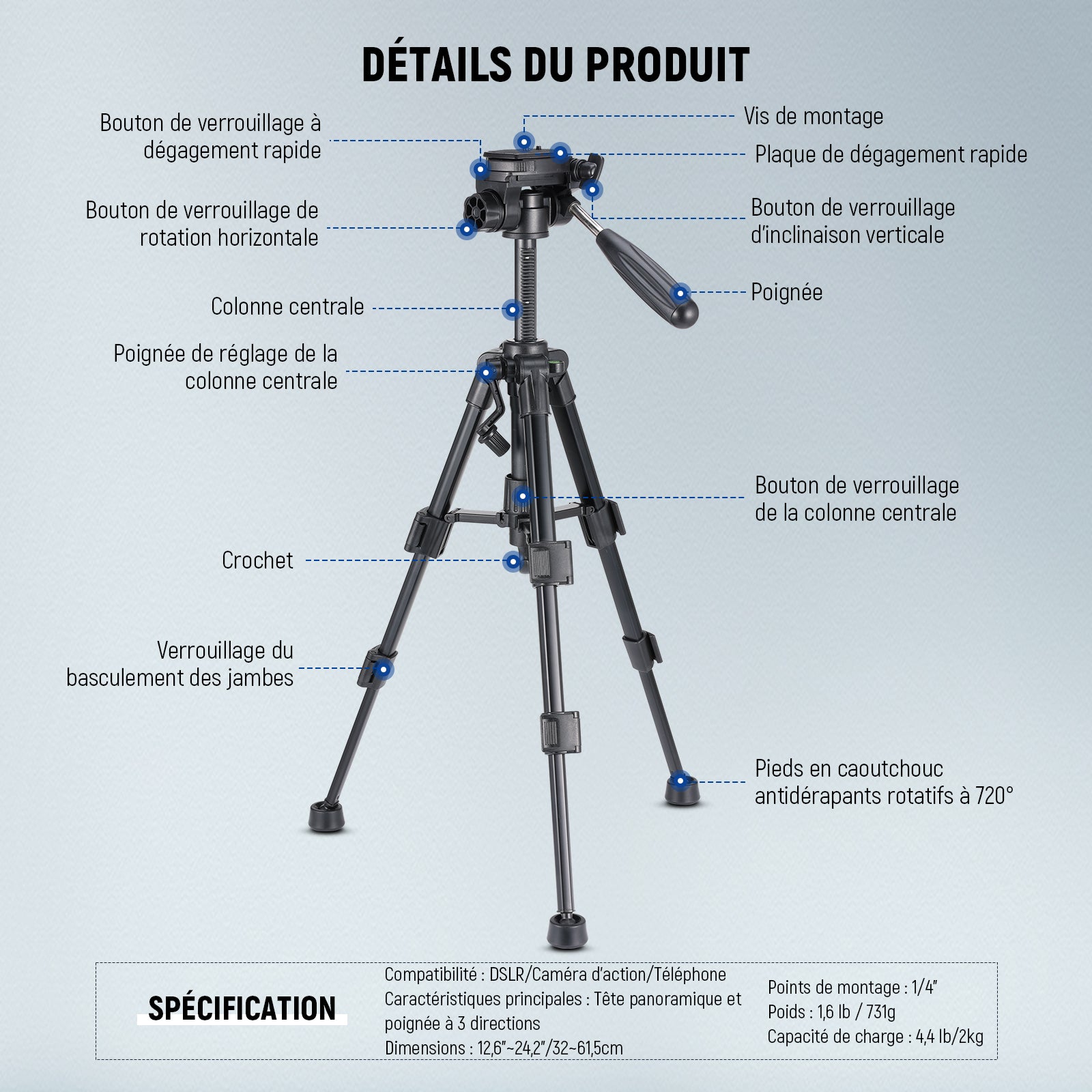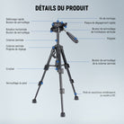 - Caractéristiques principales : Tête et poignée panoramique et inclinable à 3 voies