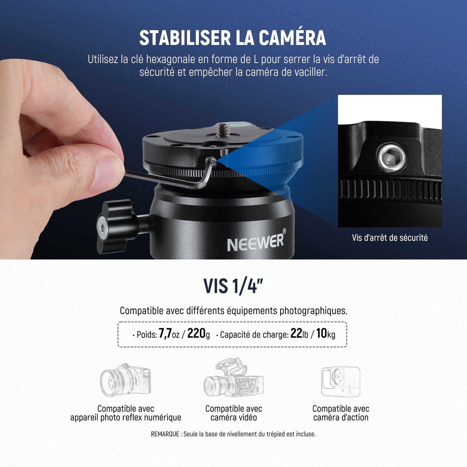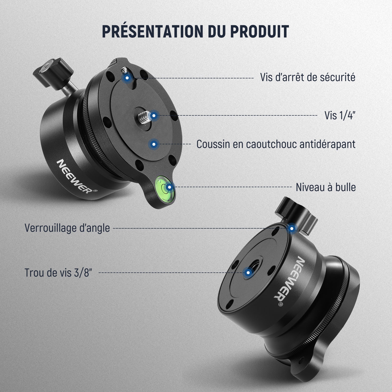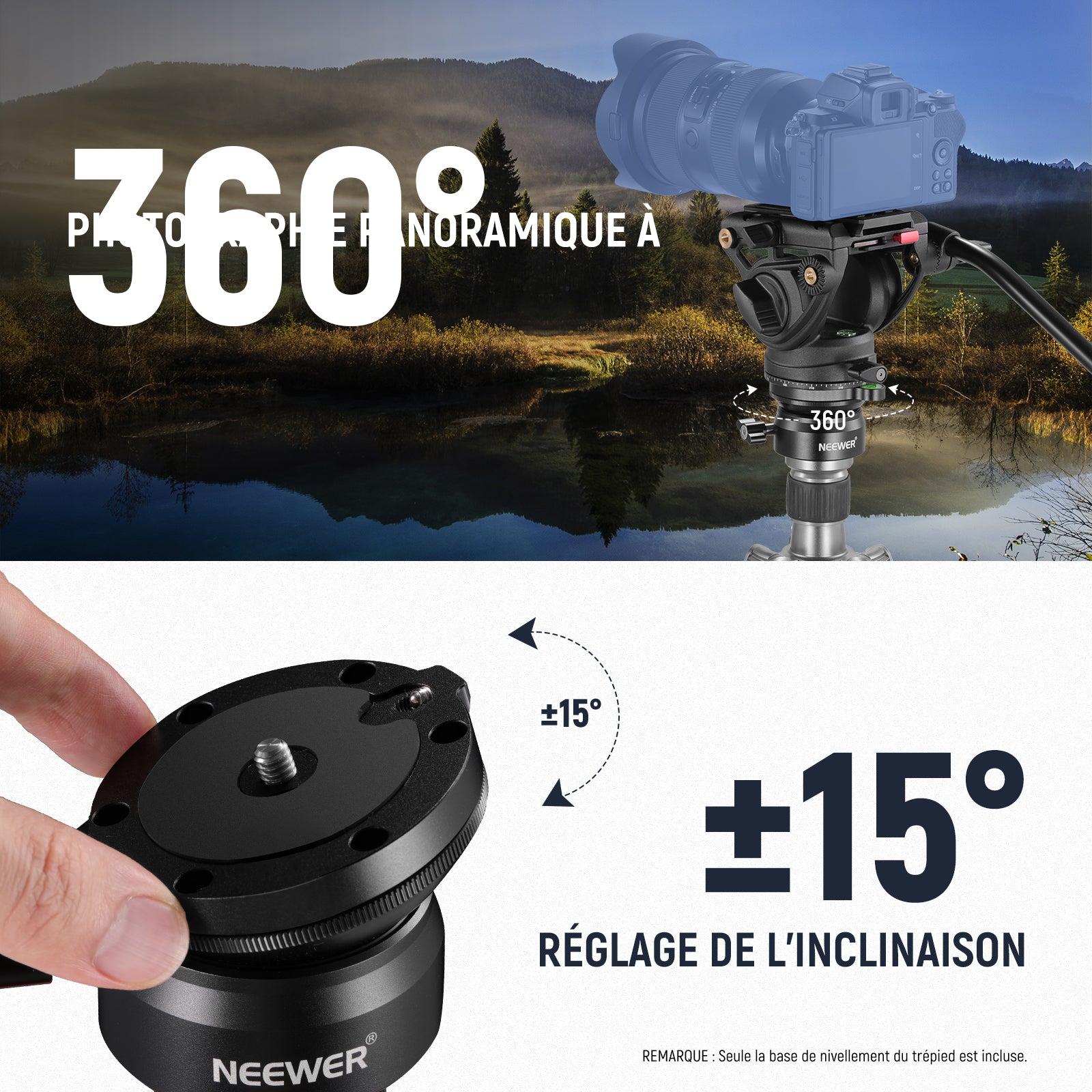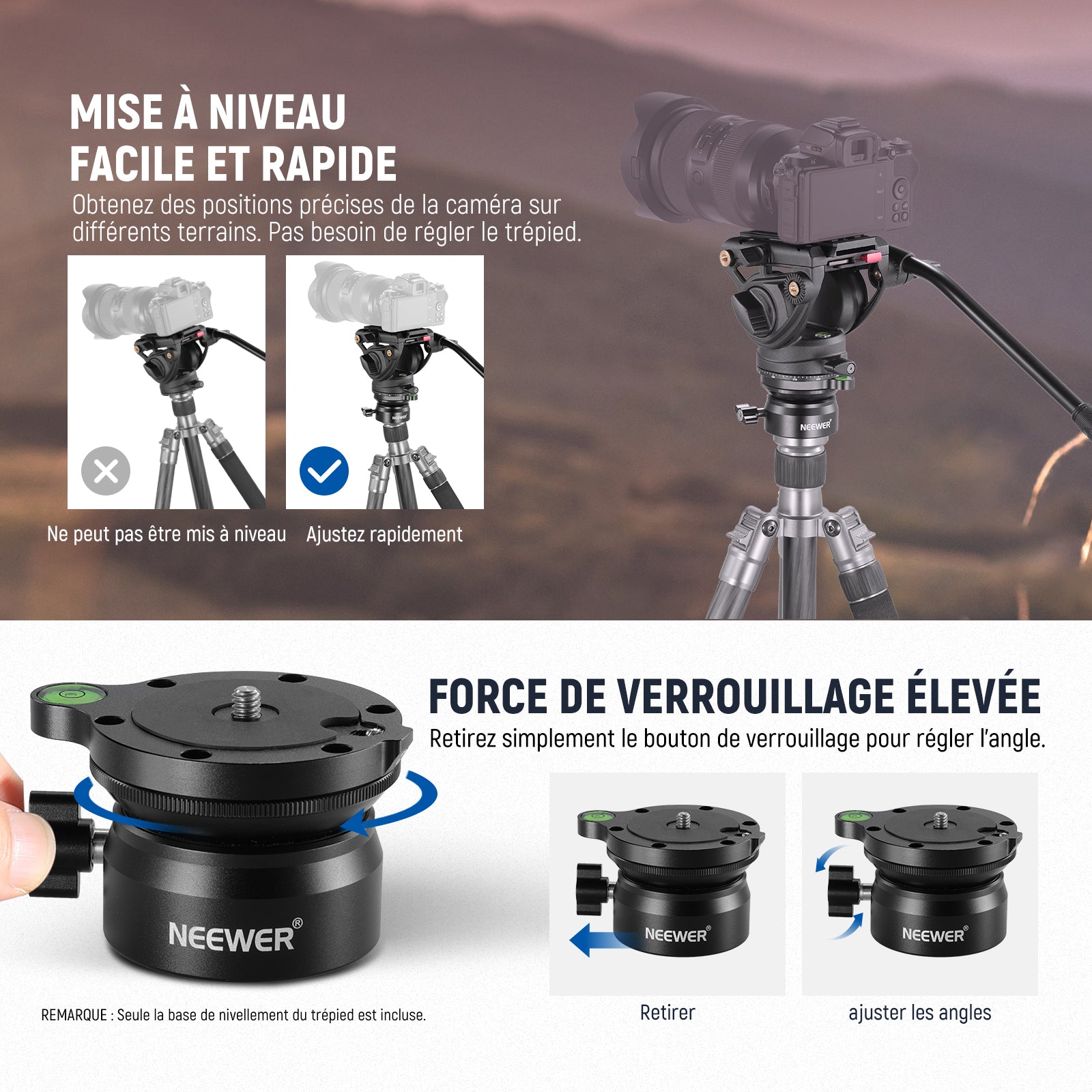 - 【Base de mise à niveau de trépied avec inclinaison de 12° vers le haut et vers le bas】Pourvu d'une conception d'inclinaison de -12°/+12°, couplée à un mouvement panoramique de 360°, la tête de mise à niveau de trépied NEEWER offre plus de stabilité et fournit un angle de prise de vue flexible, notamment pour les prises de vue aériennes. Un bouton de verrouillage permet de fixer rapidement l'appareil photo en place, et une vis de serrage maintient l'appareil fermement attaché.