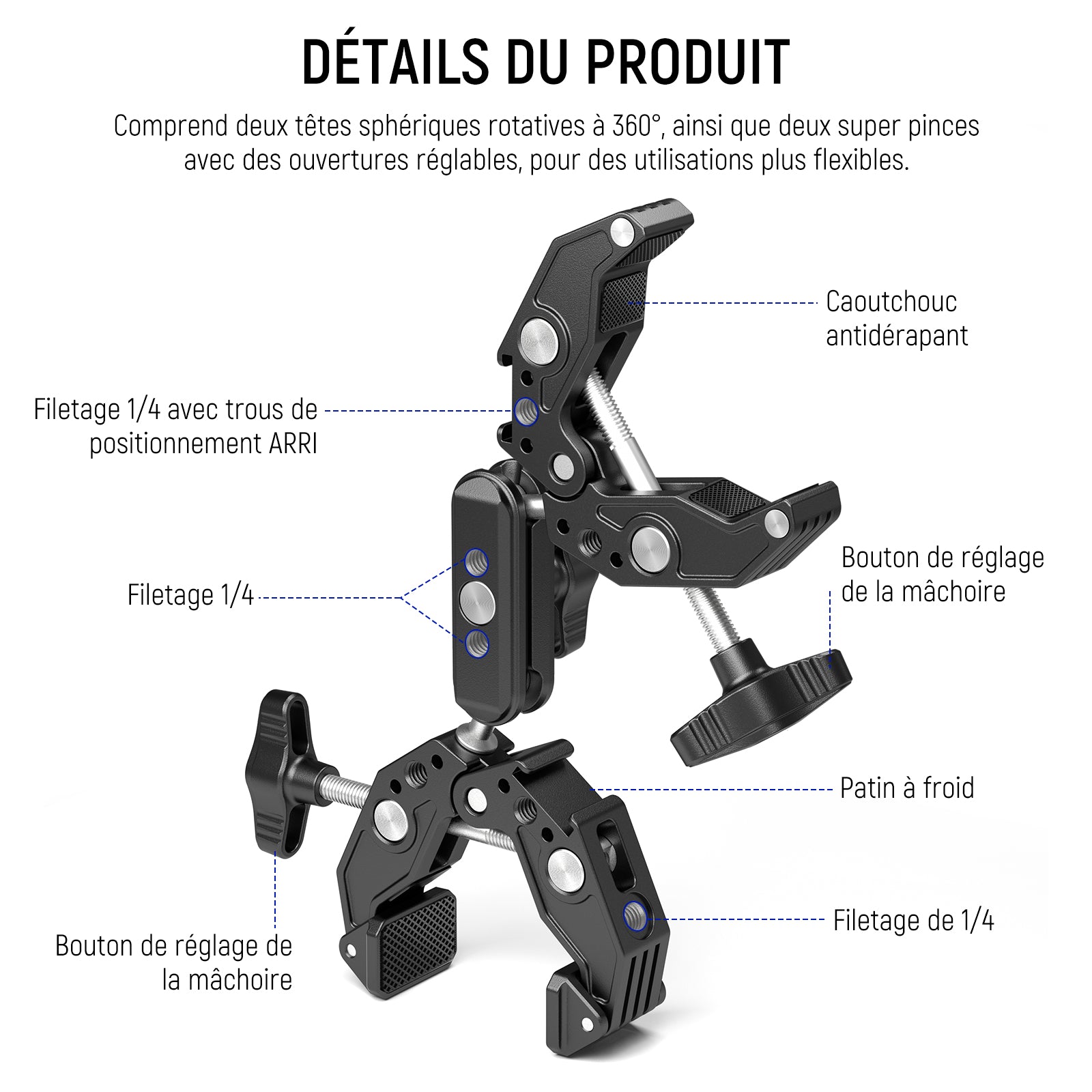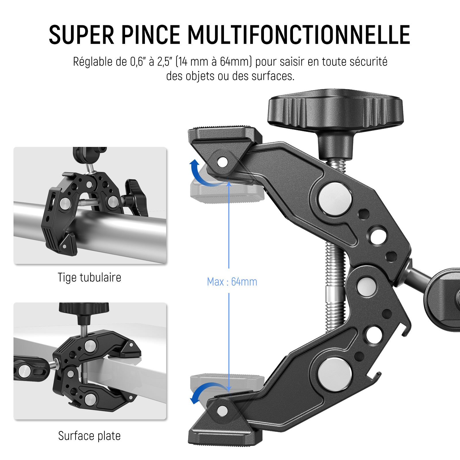 - 【Positionnement angulaire flexible】 Relié par deux têtes sphériques rotatives à 360°, ce bras magique peut être facilement ajusté à l'angle désiré, et sécurisé par le bouton à vis. Remarque : le bras magique et les super pinces sont attachés et ne peuvent pas être utilisés séparément.