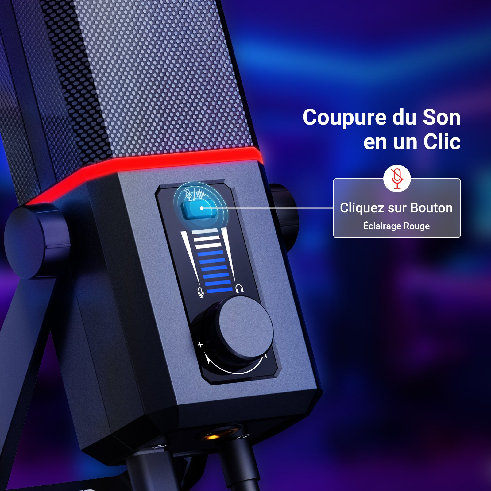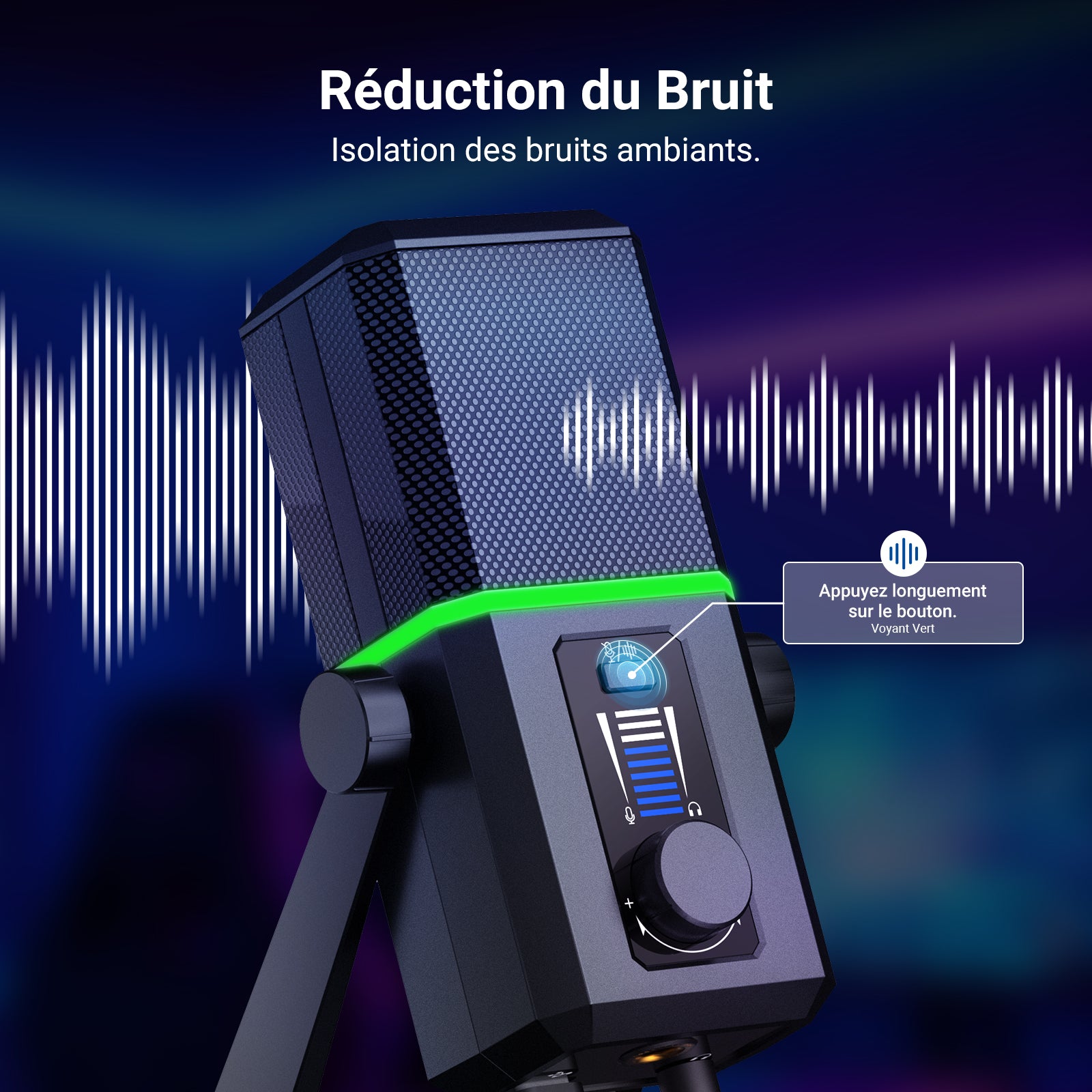 • 【Suppression active du bruit】 Appuyez une fois pour désactiver le son (indicateur rouge) sur le microphone à condensateur. Appuyez et maintenez enfoncé pour activer la suppression du bruit du micro (indicateur vert) pour les jeux, le streaming en direct professionnel, l'enregistrement de chant en studio, les podcasts, les vidéoconférences Zoom et l'enseignement en ligne