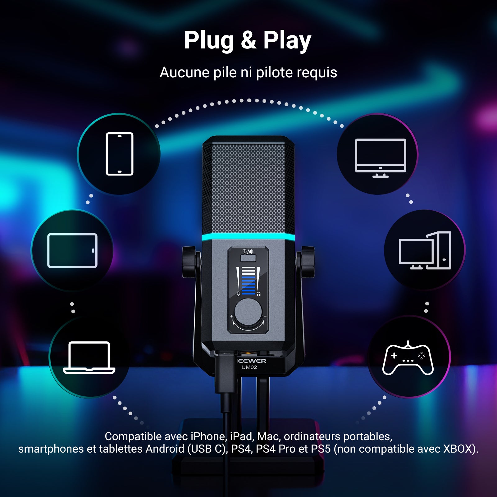 • Microphone de jeu USB RVB : micro USB externe Plug & Play avec indicateur RVB et éclairage d'ambiance, pas de piles ou de pilotes nécessaires. Câble USB 4 en 1 compatible avec iPhone iPad Mac ordinateur portable USB C Android smartphone tablette PS4 PS4 Pro PS5 (pas pour XBOX). Sélectionnez l'entrée audio lors de la connexion à différents appareils