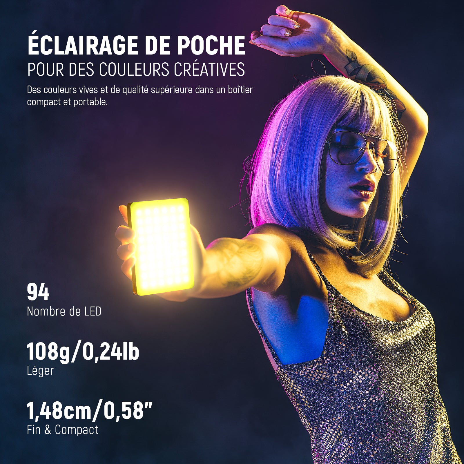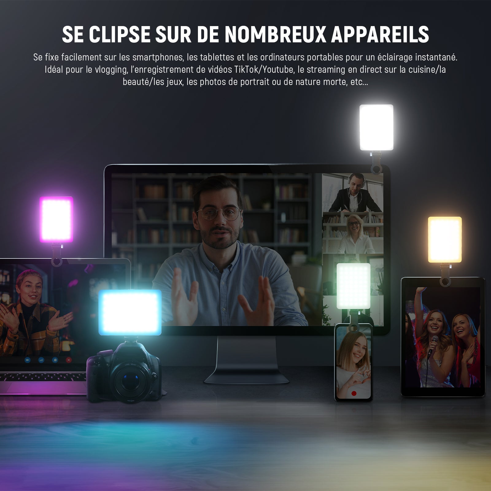 - 【Puissant & Couleurs RGB Polyvalentes】 Avec 94 LED puissantes, cet éclairage RGB couleur 5W fournit un éclairement maximum de 450lux à 0,5m et offre un choix impressionnant jusqu'à 36000 couleurs avec un IRC élevé de 97 pour un rendu plus précis des couleurs, sans scintillement ni éblouissement. Idéal pour les selfies, le vlogging, le streaming cuisine/beauté/jeu, l'enregistrement de vidéos TikTok/Youtube, la photo de portrait/de nature morte, etc… Distance d'éclairage recommandée : 1,5m/4,9“