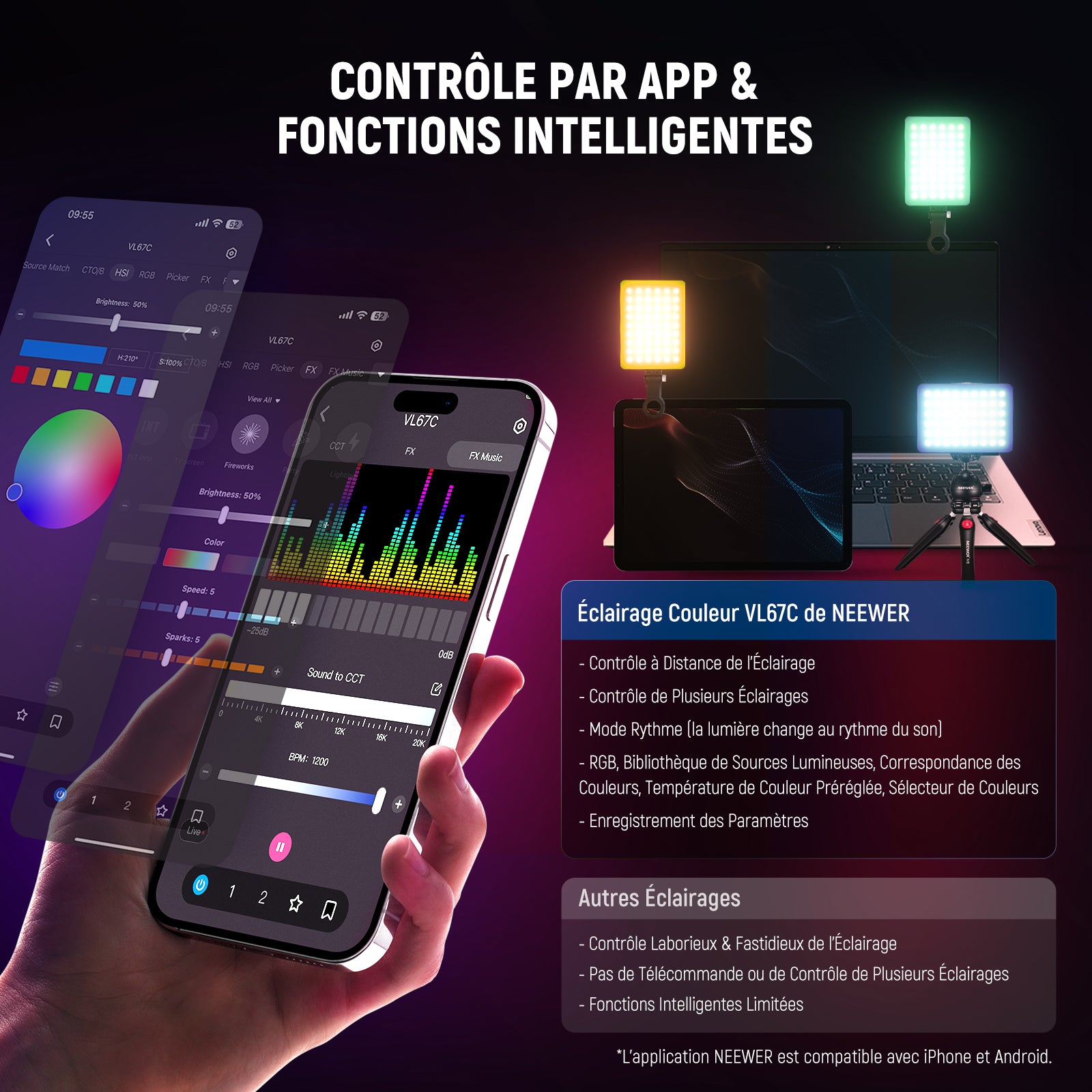 - 【Éclairage Vidéo RGB Portable avec Contrôle App Intelligent】 Modernisé avec un module Bluetooth avancé pour le contrôle sans fil d'un ou plusieurs éclairages LED avec votre téléphone via l'APP NEEWER, débloquez les fonctions intelligentes: mode RGB, synchro avec la musique, bibliothèque de sources lumineuses, correspondance des couleurs, température de couleur préréglée, sélecteur de couleurs & enregistrement des paramètres. Il pèse 108g, une épaisseur de 1,48cm et tient dans la paume de la main