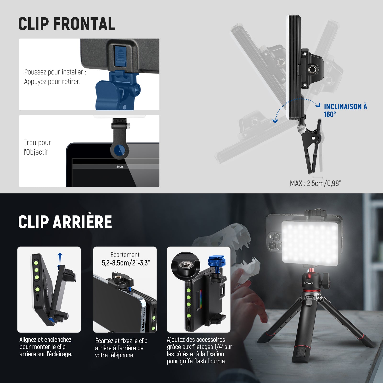 【Lumière sur appareil photo avec support griffe】le support de griffe inclus fonctionne avec les filetages latéraux de 6,35mm sur le clip arrière pour installer la lumière selfie sur les appareils photo, avec une ouverture de 5,2 à 8,5cm compatible avec iPhone 16 15 14 13 Pro Max Samsung Galaxy S24 S23 S22 Ultra Huawei Pixel 8 7 Pro, etc. Le clip avant s'adapte aux téléphones, tablettes ou ordinateurs portables de moins de 2,5cm d'épaisseur, et permet une inclinaison à 160° avant et arrière