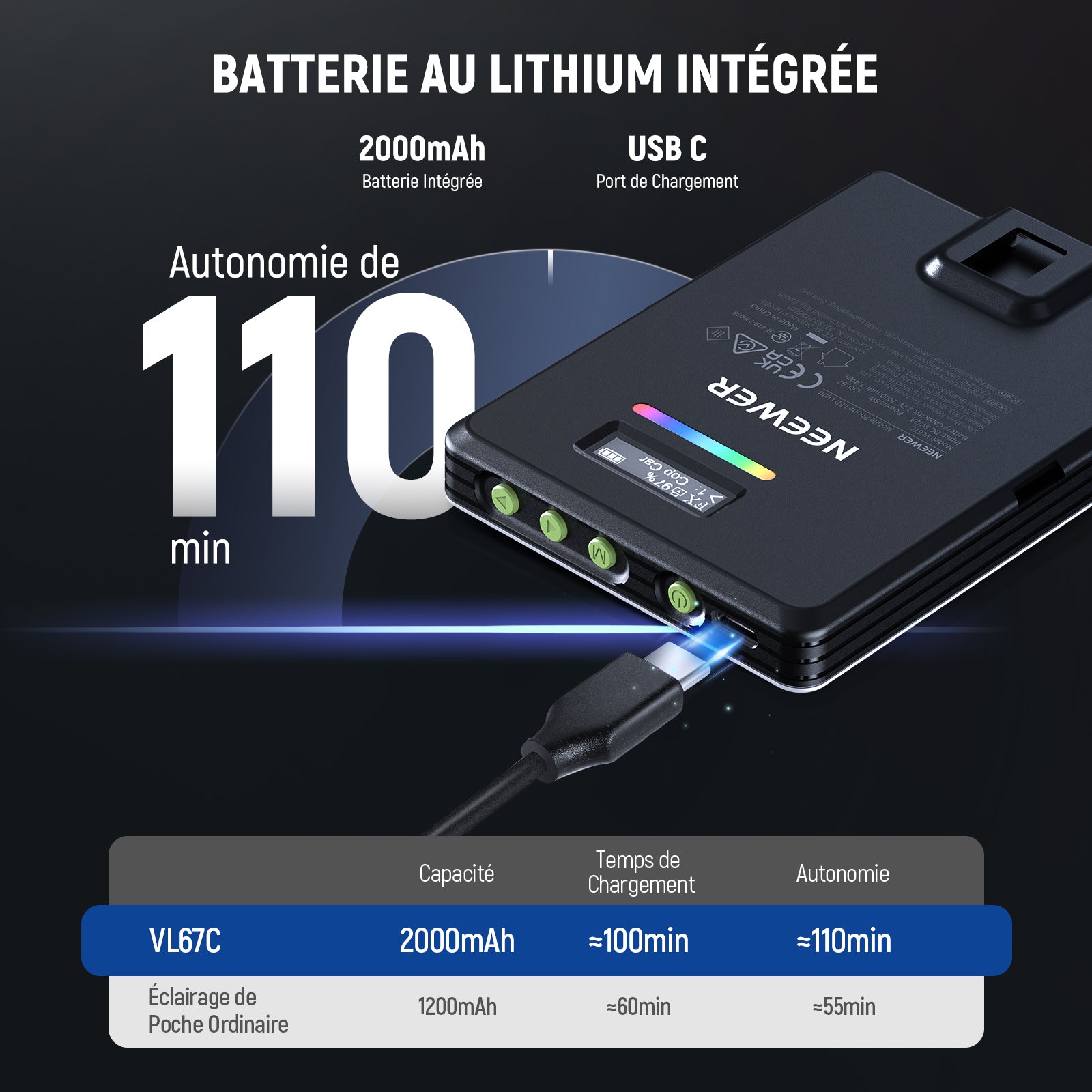 - 【Batterie Lithium Rechargeable de 2000mAh】 La batterie au lithium 3,7V 2000mAh offre jusqu'à 110 minutes d'éclairage continu à 100% de luminosité. Complètement chargée en seulement 100 minutes avec le port USB C 5V 2A, elle se recharge directement pendant l'utilisation, assurant ainsi une alimentation sans interruption pendant toute la journée.