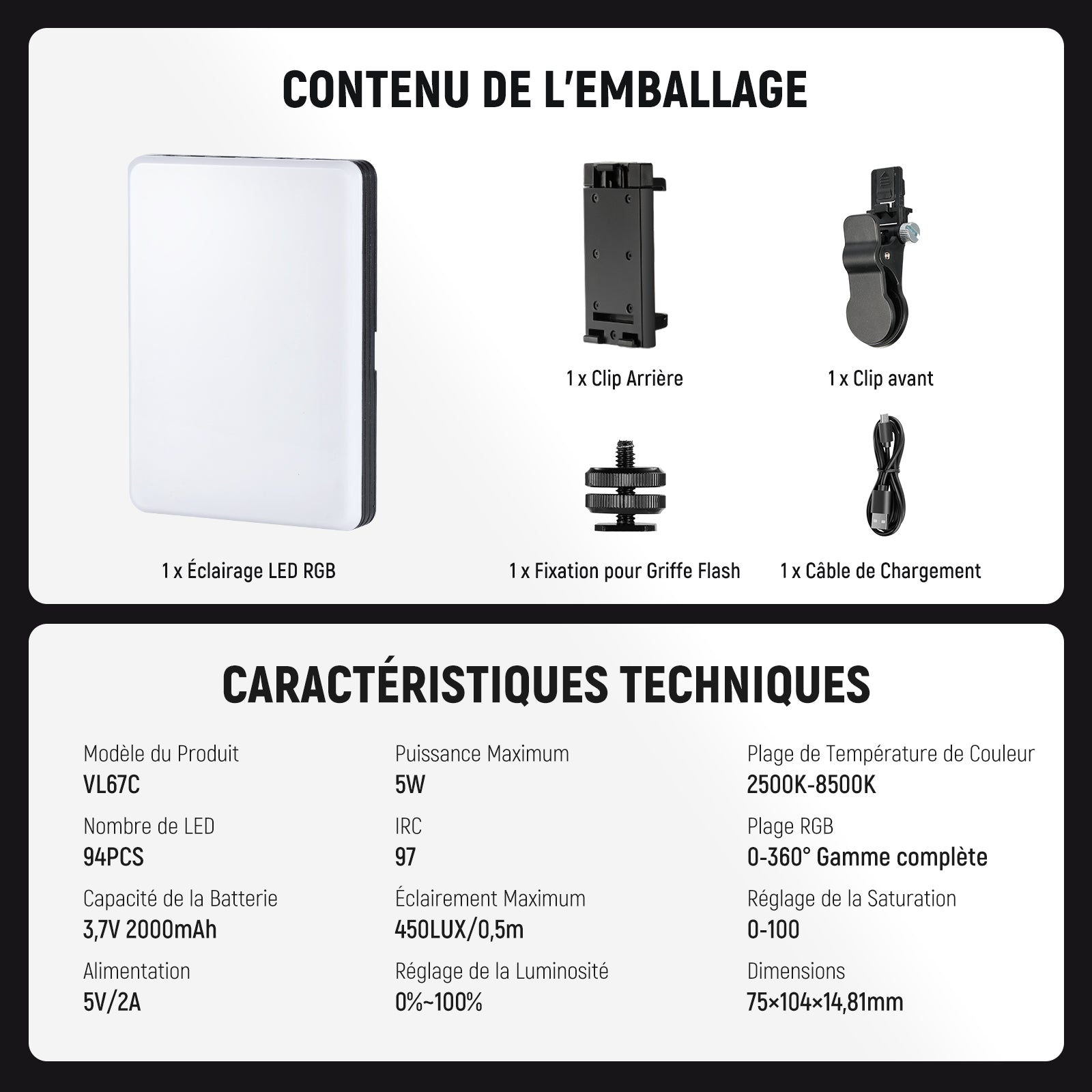- Température de Couleur : 2500K~8500K