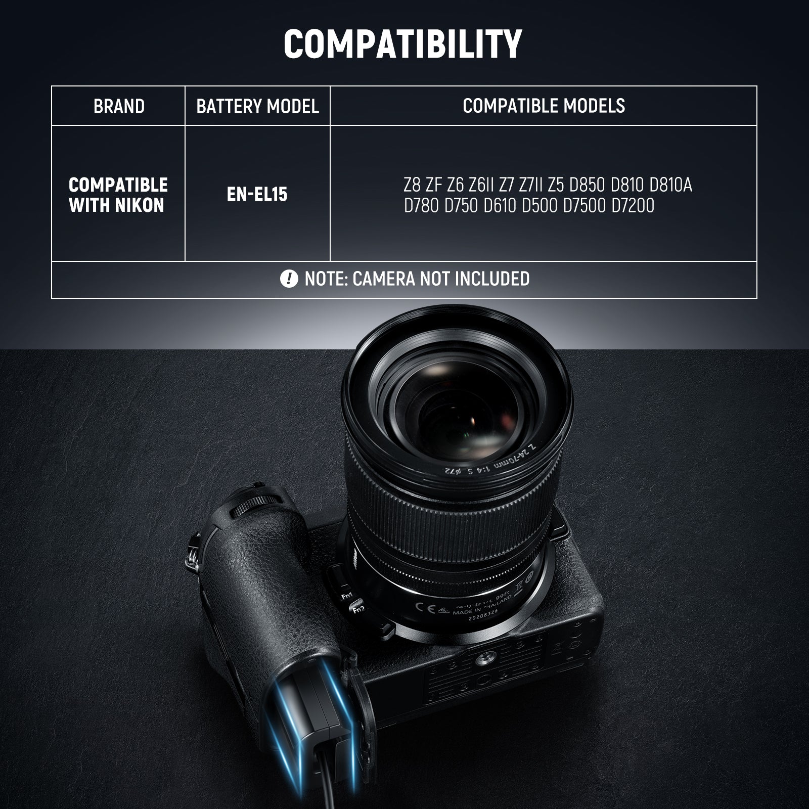 - Compatible Device Models- This dummy battery is a replacement battery for Nikon EN-EL15, and is fully compatible with Nikon Z8 Zf Z6 Z6II Z7 Z7II Z5 D850 D810 D810A D780 D750 D610 D500 D7500 D7200 cameras that accept EN-EL15 EN-EL15a EN-EL15b EN-EL15c batteries