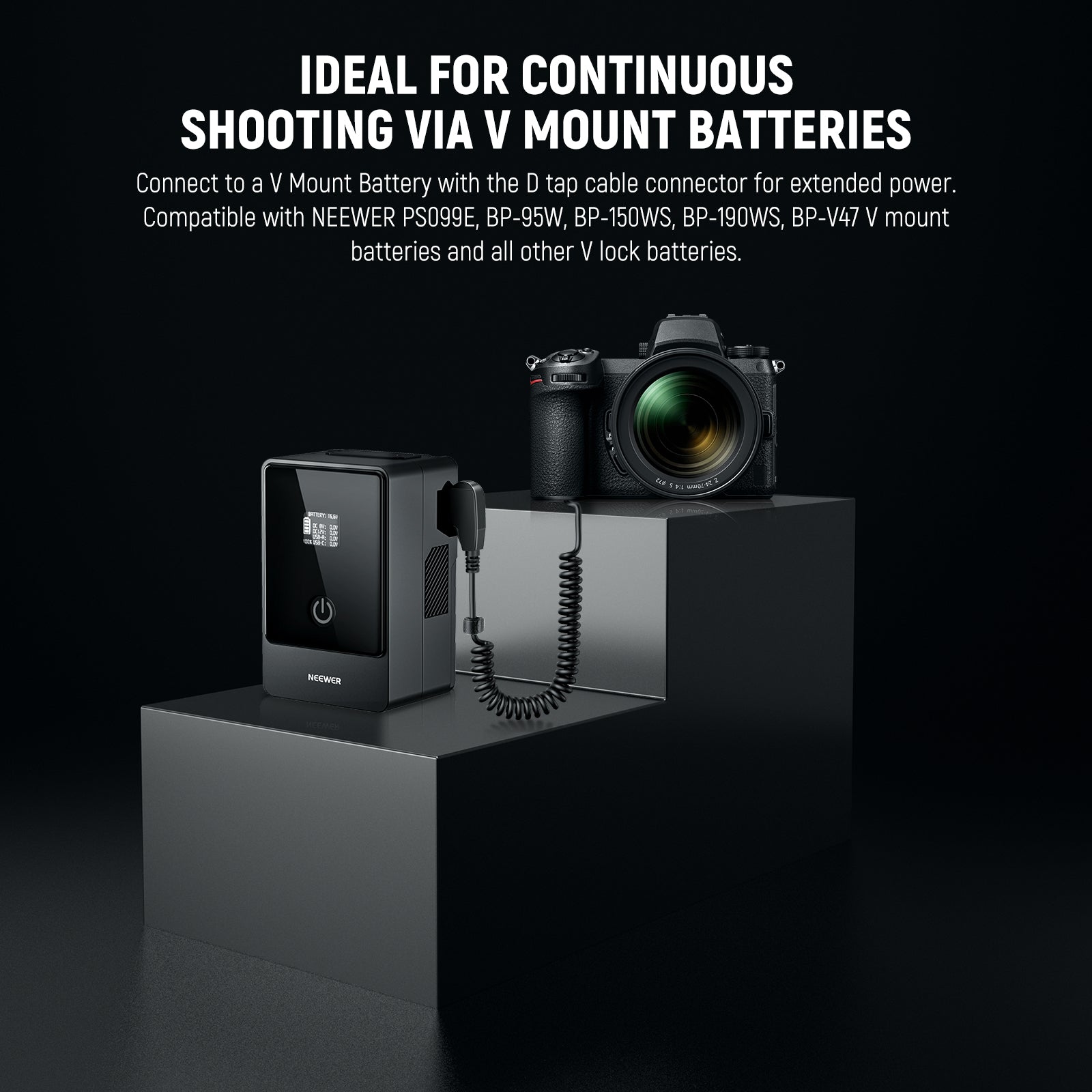 - Ideal for Continuous Shooting Via V Mount Batteries- With a D tap cable connector, it can work with NEEWER PS099E, BP-95W, BP-150WS, BP-190WS, BP-V47 V mount batteries and all other V lock batteries. Compatible with SmallRig v mount battery Series, compatible with Sony BP-U65 BP-U68 BP-U100 BP-U90 V mount batteries