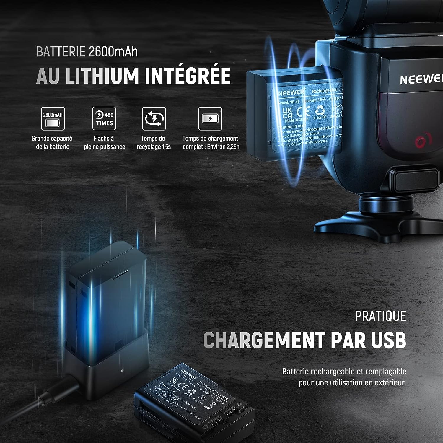 - 【Grande capacité et recyclage rapide】 La batterie au lithium 7,4V 2600mAh (NB-Z1) se recharge complètement en 2 heures et 15 minutes environ, elle peut produire 480 flashs à pleine puissance et un temps de recyclage rapide de 1,5s. La durée du flash est comprise entre 1/180s et 1/20000s, pour une meilleure expérience de prise de vue.
