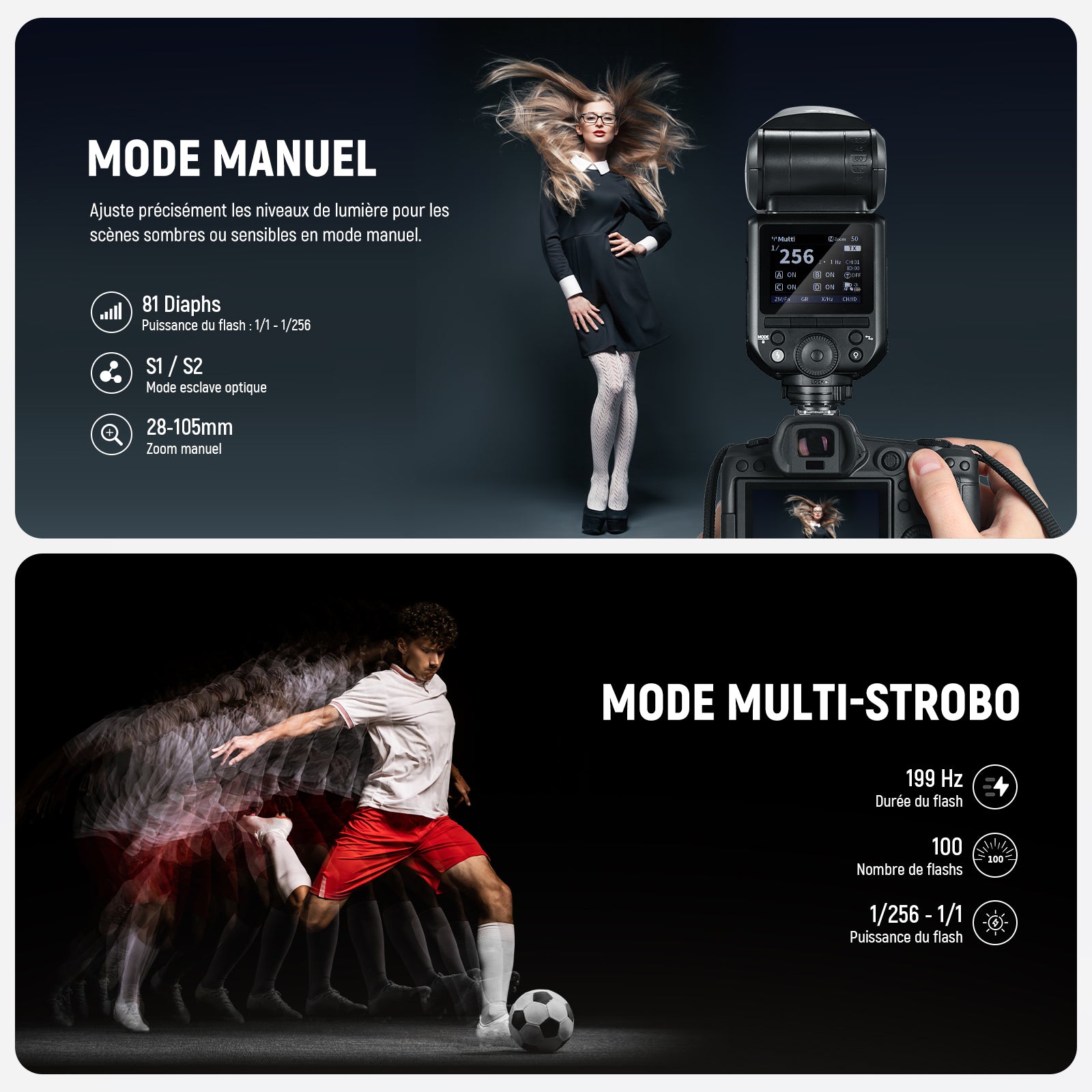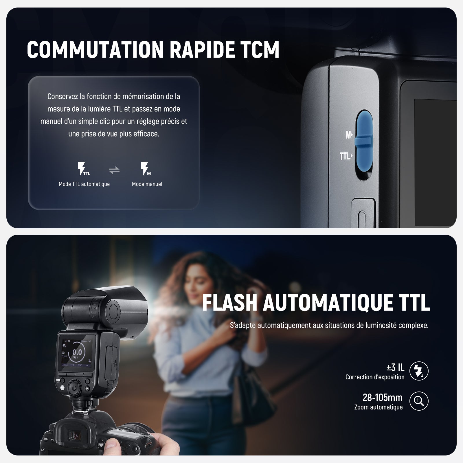 - 【Interface utilisateur et commutateur de mode TTL/M】Flash stroboscopique est doté d'interface utilisateur et de touche TCM passent du mode E-TTL au mode M en une seconde.Flash externe offre mesure automatique,gradation manuelle de 1/1 à 1/256,focale de 28 à 105mm,des flashes stroboscopiques,HSS 1/8000s,synchronisation sur le premier et le second rideau,compensation d'exposition au flash/bracketing(FEC/FEB),des modes esclaves optiques S1/S2.Mise à jour du firmware est via port USB Type-C.