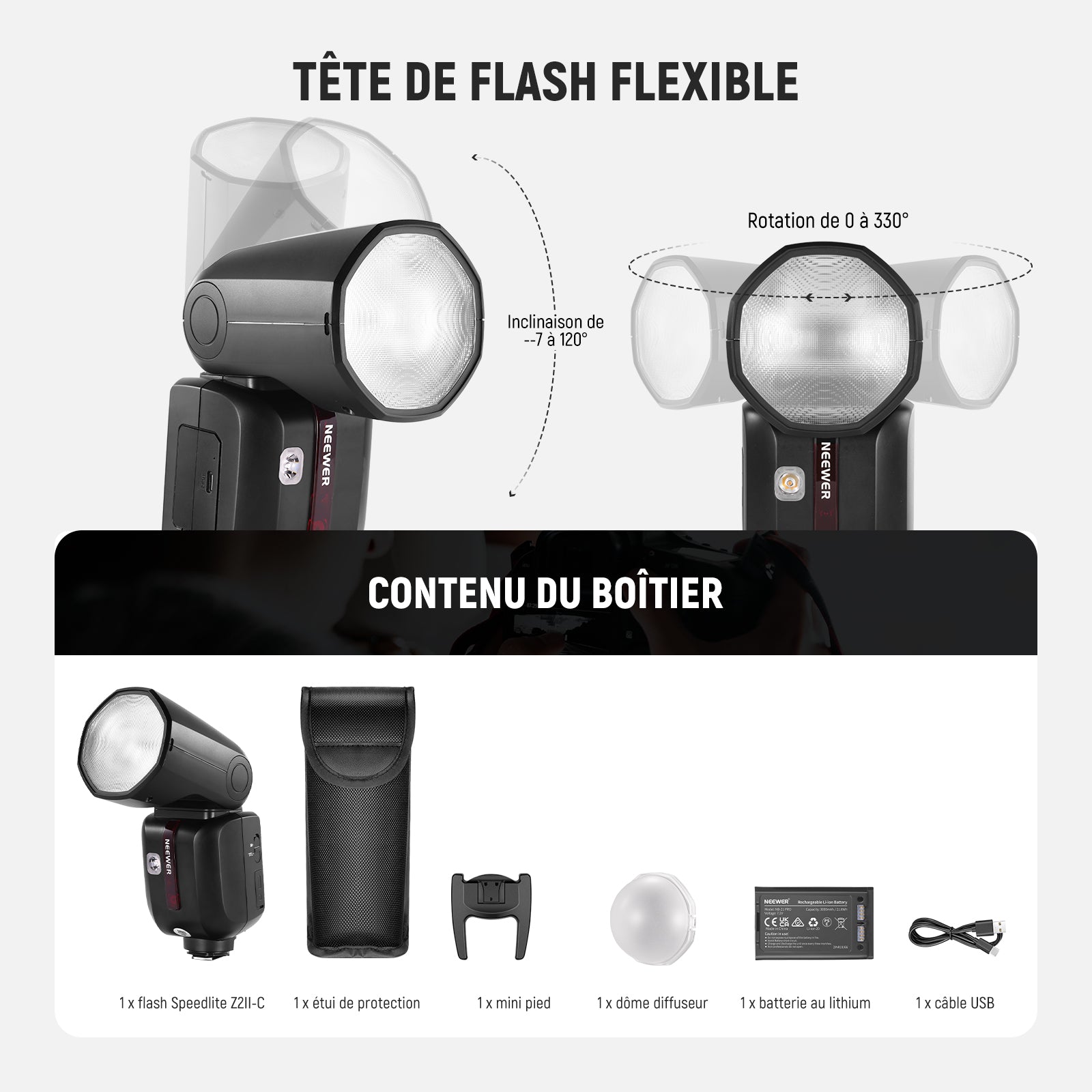 - Angle de rotation de la tête du flash : 0°–330°