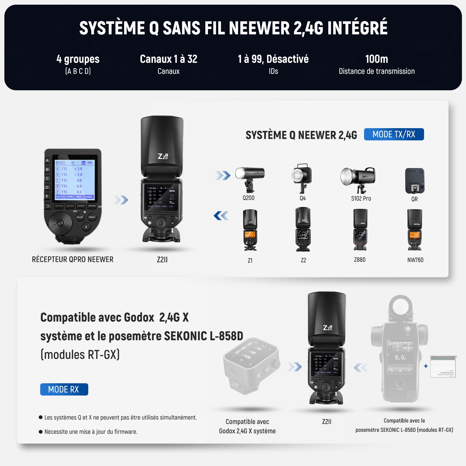- 【Système sans fil 2,4G étendu】 Contrôlez sans fil quatre groupes (A/B/C/D), 32 canaux et 99 ID avec émetteurs TTL QPRO-C(non inclus),ou en tant qu'unité maître/esclave pour flashes du système Q jusqu'à 100m.Compatible avec Godox 2,4G X système (menu RX COMPAT) ou en tant qu'unité esclave avec Xpro X3 X2 émetteurs.Compatible avec Sekonic L-858D posemètre (module RT-GX).Remarque: systèmes Q et X ne peuvent pas être utilisés simultanément;dernière version du firmware est requise pour compatibilité.