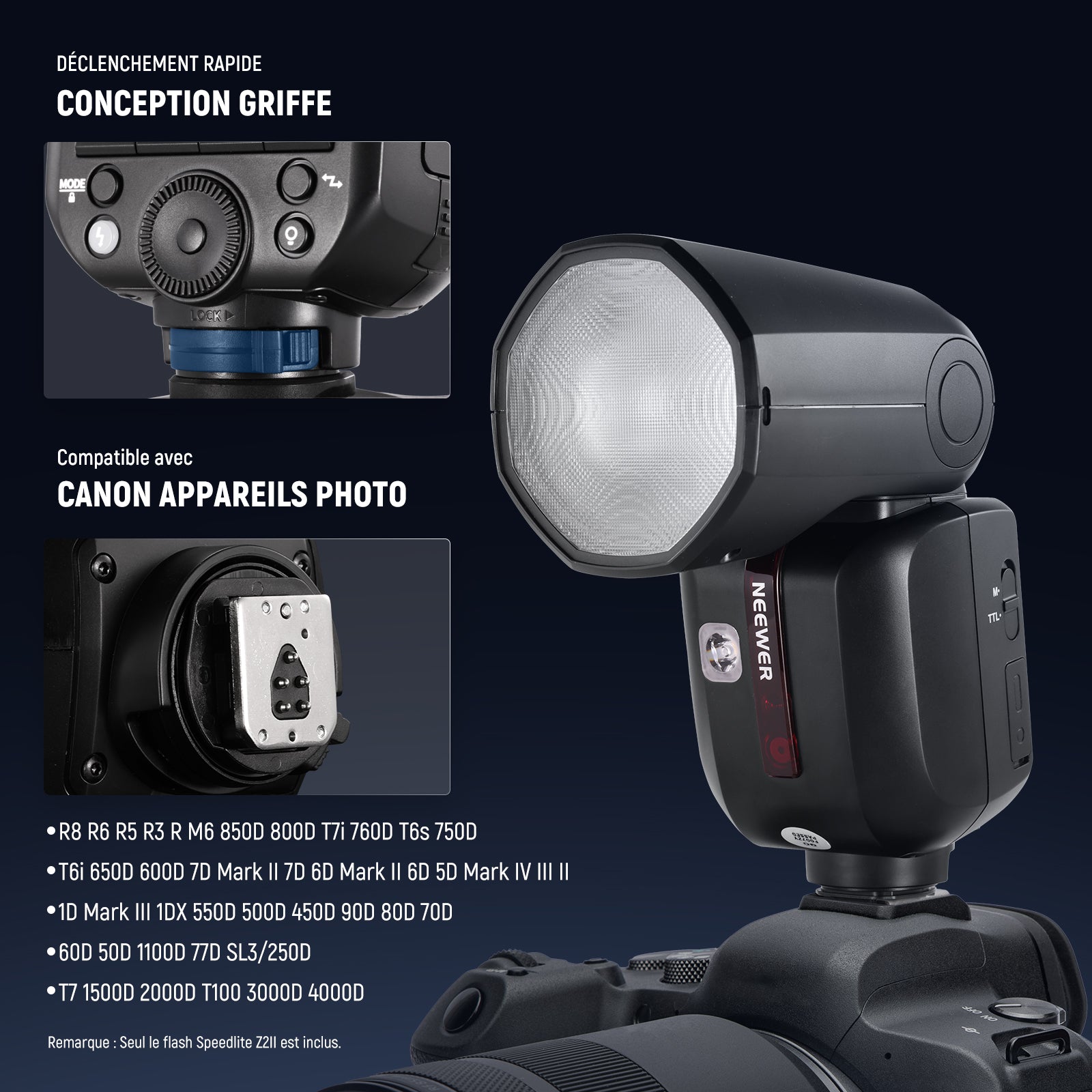 - 【Compatible avec Canon appareils photo】La tête de flash est compatible avec Canon R6, R5, R3, R, M6, 850D, 800D/T7i, 760D/T6s, 750D/T6i, 650D, 600D, 7D Mark II, 7D, 6D Mark II, 6D, 5D Mark IV/III/II, 1D Mark III, 1DX, 550D, 500D, 450D, 90D, 80D, 70D, 60D, 50D, 1100D, 77D, SL3/250D, T7/1500D, 2000D, T100/3000D. 4000D (NON compatible avec RP R50), et compatible avec la monture de type NEEWER CRM2 M12 CRS6 CRS7 CRB1 S2 et divers accessoires de flash circulaire